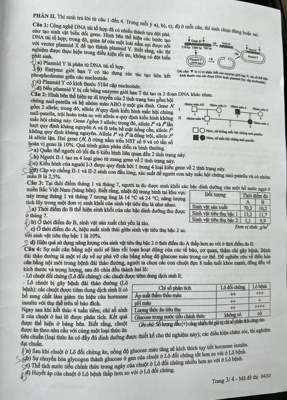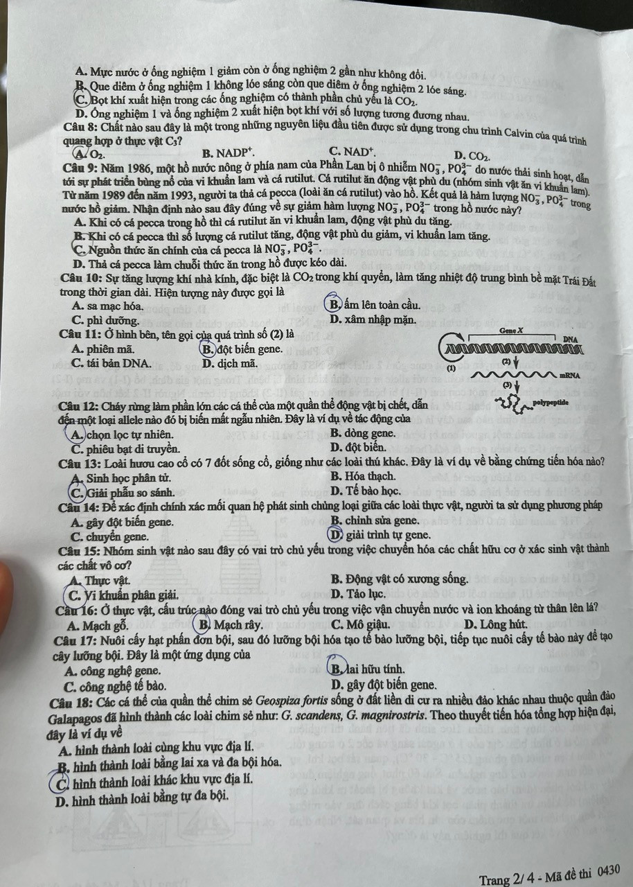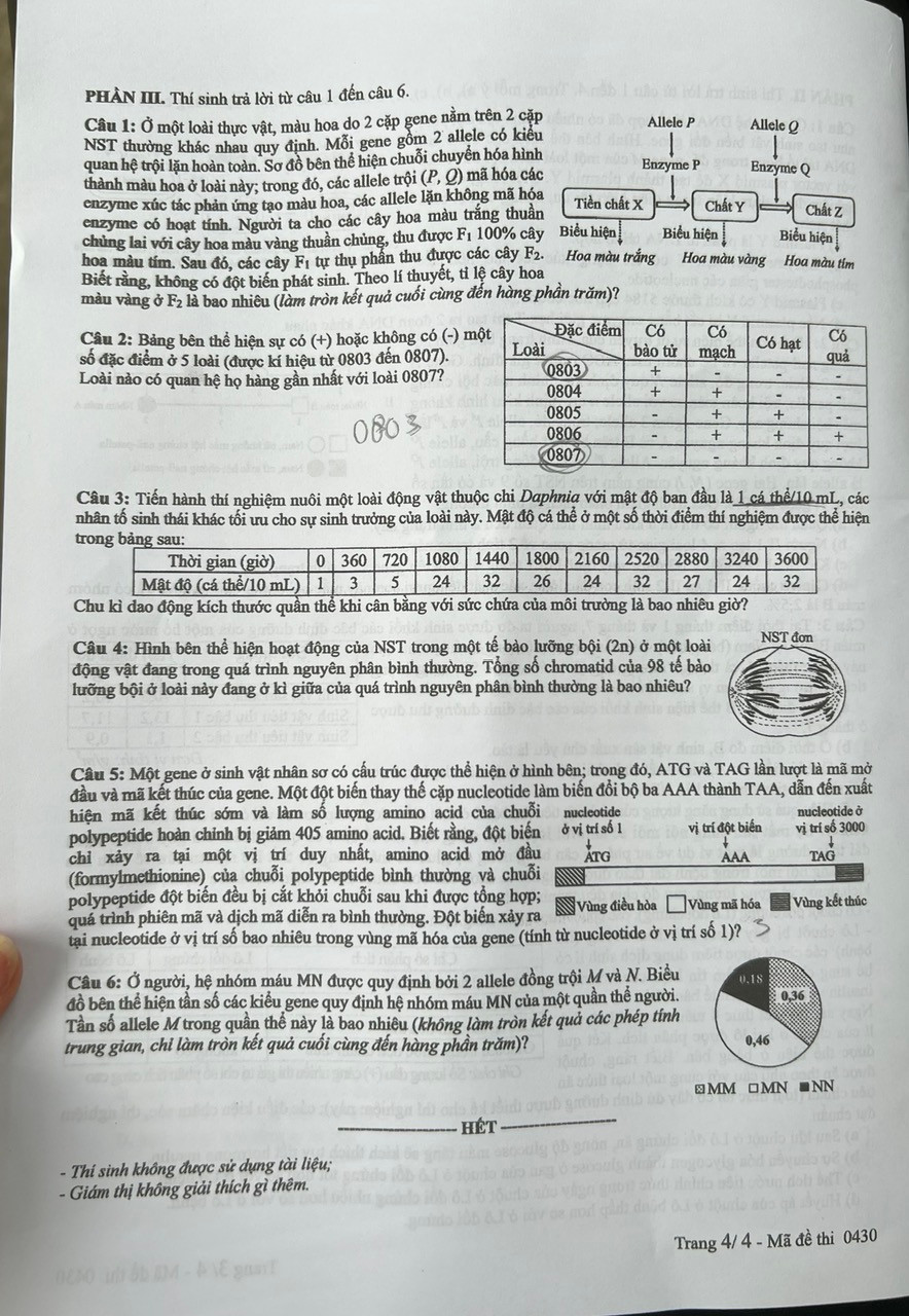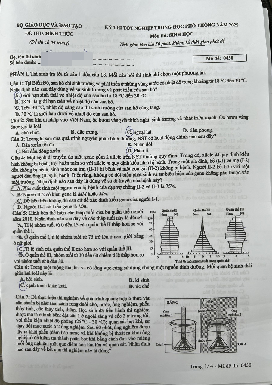 Dưới đây là đề thi môn Sinh học theo Chương trình GDPT 2018 mã đề 0430: