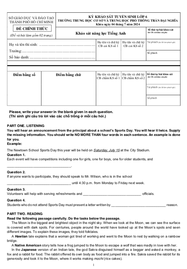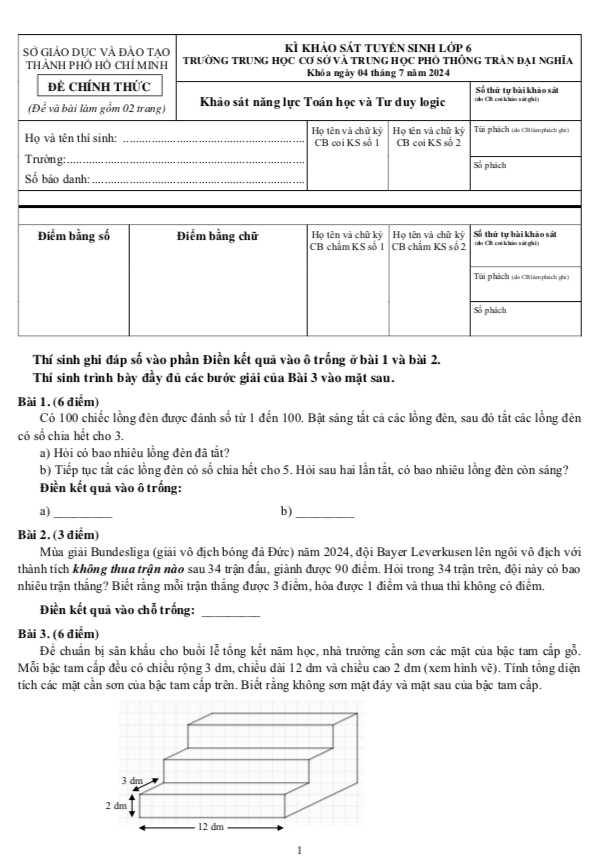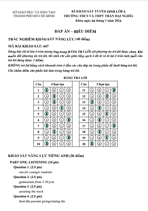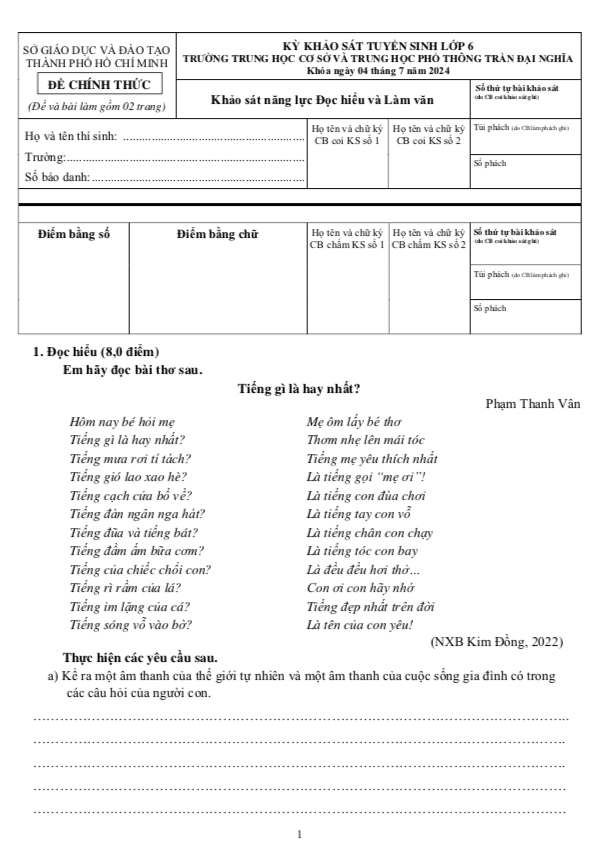 TPO - Chiều 5/7, Sở Giáo dục và Đào tạo TPHCM công bố đề và đáp án kỳ khảo sát vào lớp 6 Trường Trần Đại Nghĩa năm 2024.