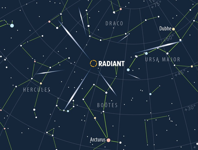 Vì vậy, để định vị nơi các quả cầu lửa phát ra, bạn nên tìm kiếm các chòm sao Mục Phu (Bootes) hình người chăn bò và Thiên Long (Draco) hình con rồng. Mưa sao băng sẽ phát ra từ vị trí chính giữa hai chòm sao này.