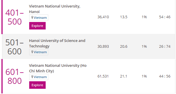 Trước đó, ngày 2/09, Times Higher Education, THE công bố kết quả Xếp hạng đại học thế giới - World University Rankings, WUR 2021. Theo đó, ĐHQG Hà Nội và 2 cơ sở giáo dục đại học của Việt Nam được THE công bố thứ hạng cùng với 1.527 cơ sở giáo dục đại học hàng đầu thế giới. Căn cứ theo báo cáo kết quả xếp hạng, ĐHQG Hà Nội thuộc nhóm 801 - 1.000 thế giới; ĐHQG TP. HCM và trường ĐH Bách khoa Hà Nội thuộc nhóm 1.001+. Như vậy, ĐHQG Hà Nội là cơ sở giáo dục đại học duy nhất của Việt Nam nằm trong nhóm 1.000 trường đạ học hàng đầu thế giới của Bảng xếp hạng này.