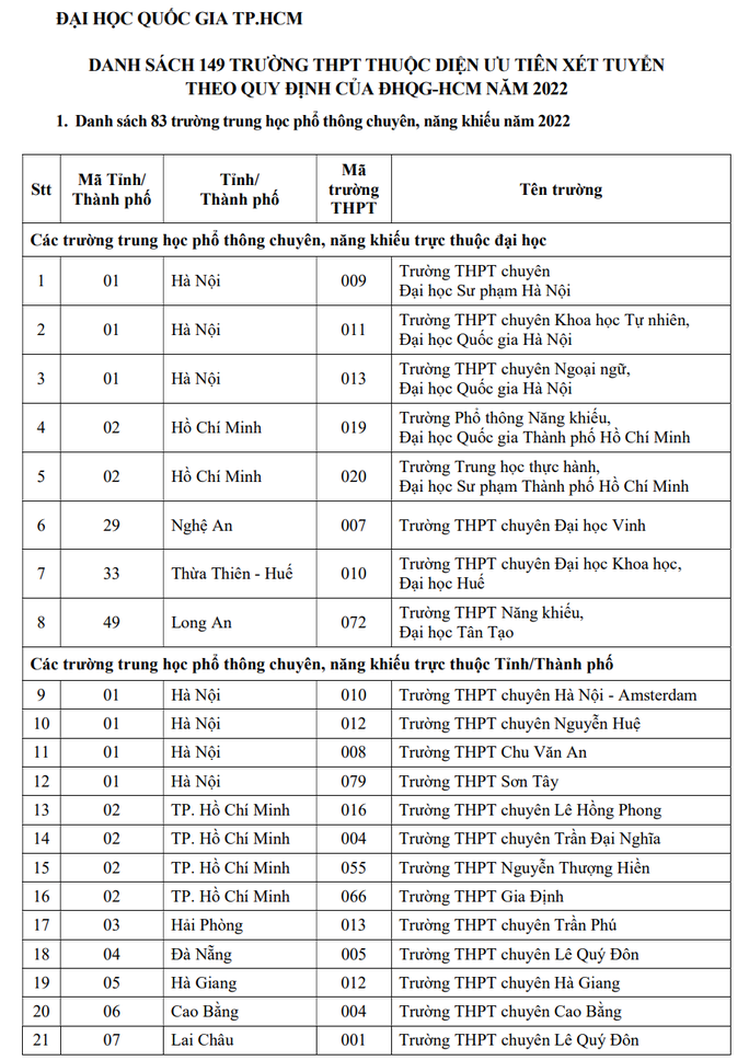 Danh sách 149 trường THPT thuộc diện ưu tiên xét tuyển của các trường thành viên, khoa trực thuộc ĐHQG TP. HCM:
