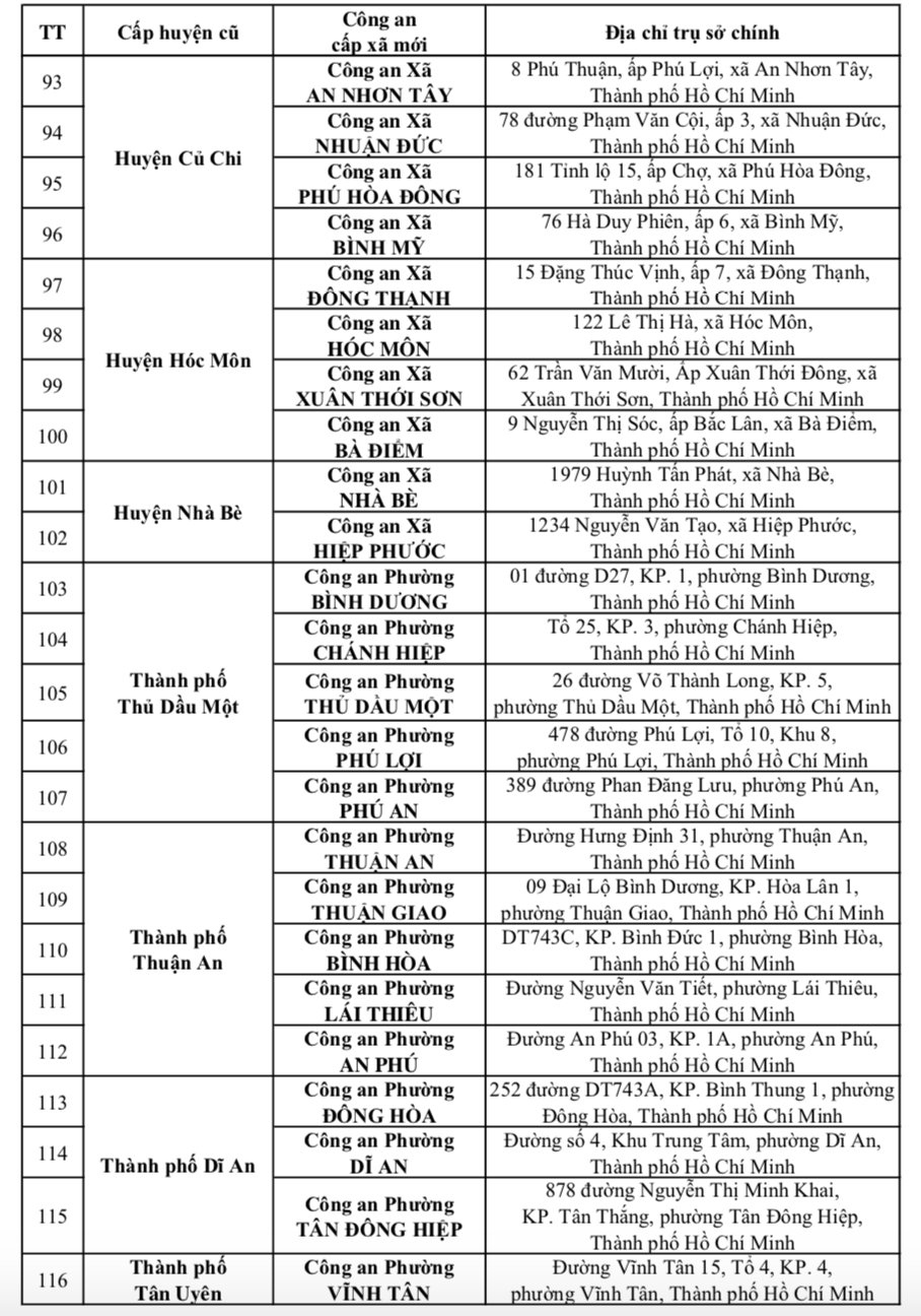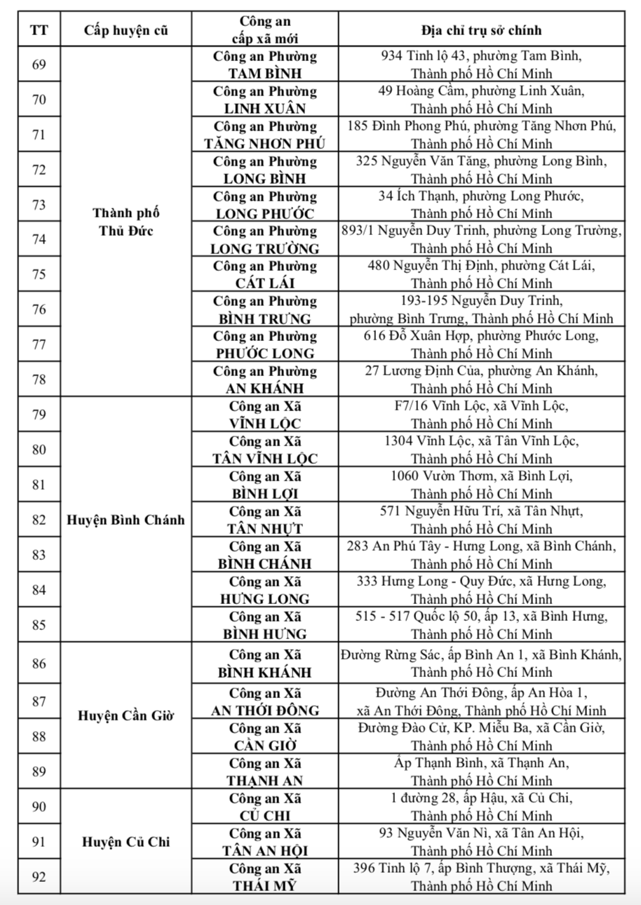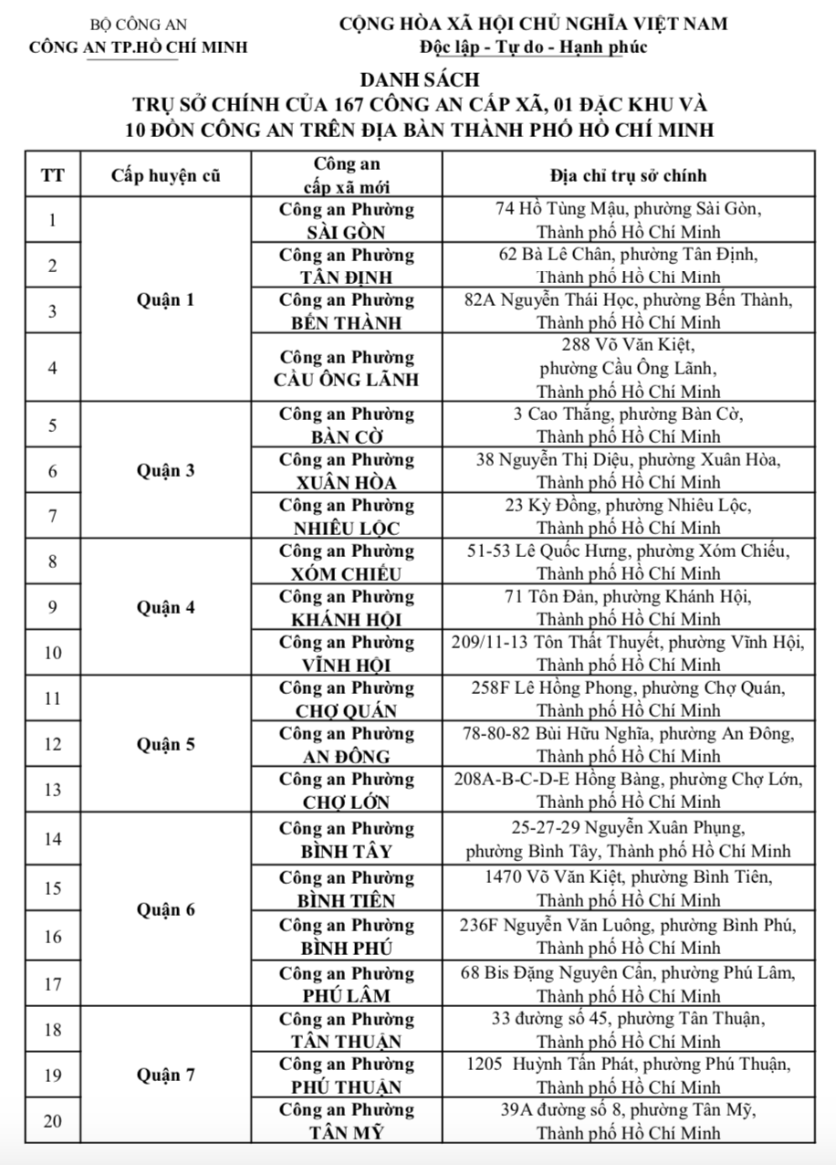 Để các đơn vị, tổ chức và toàn thể nhân dân biết và tiện liên hệ công tác khi cần thiết, Công an TPHCM thông báo danh sách địa chỉ trụ sở chính của 167 Công an cấp xã, 1 đặc khu và 10 đồn công an thuộc Công an TPHCM.