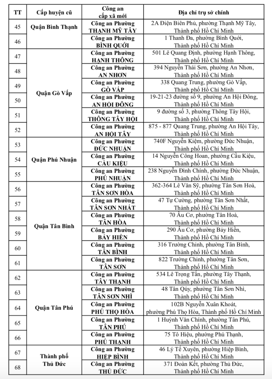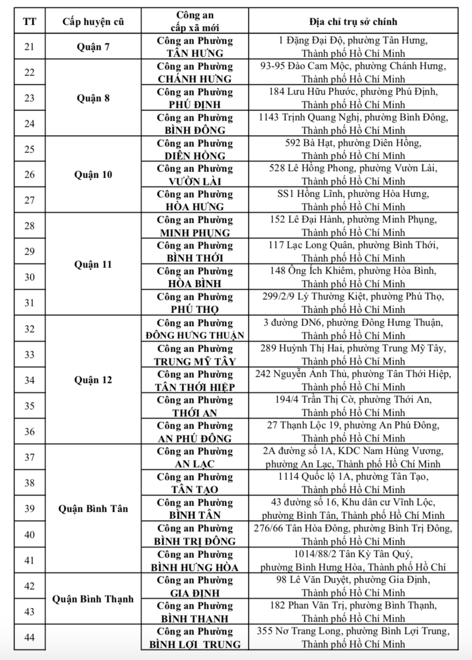 TPO - Công an TPHCM vừa thông báo danh sách địa chỉ trụ sở chính của 167 Công an cấp xã, 1 đặc khu, 10 đồn Công an thuộc Công an TPHCM và 49 điểm thu nhận hồ sơ cấp căn cước trên địa bàn thành phố.