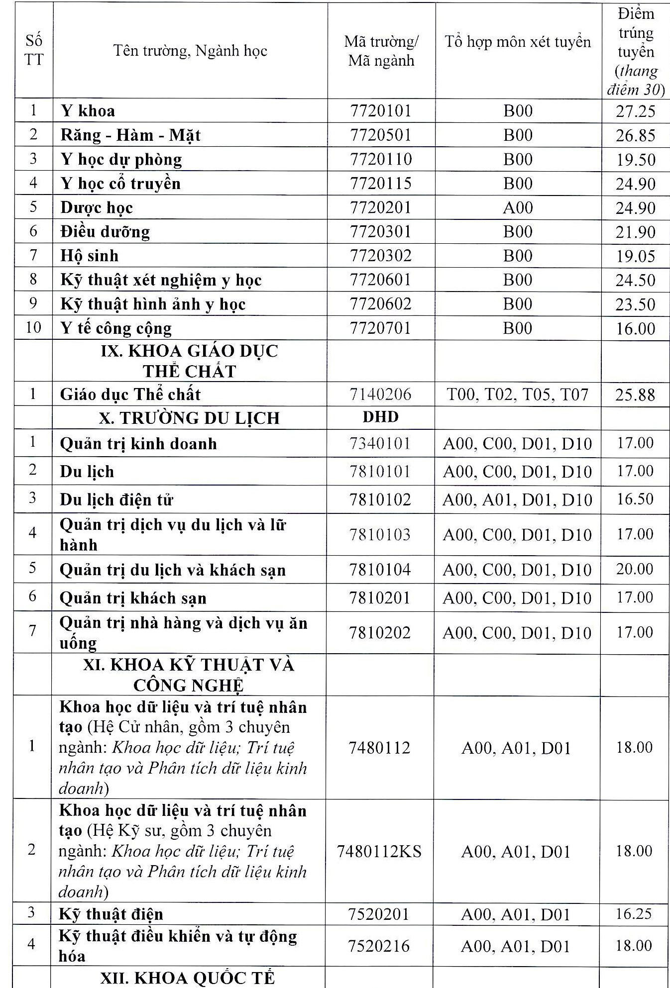 Trường ĐH Y Dược: Ngành có điểm chuẩn cao nhất là Y khoa với 27,25 điểm. Đây cũng là ngành có điểm chuẩn cao nhất trong toàn hệ thống ĐH Huế. Các ngành khác của trường ĐH Y Dược cũng có mức điểm tương đối cao, từ 16 - 26,85 điểm. Ngành thấp nhất là Y tế công cộng (16 điểm).