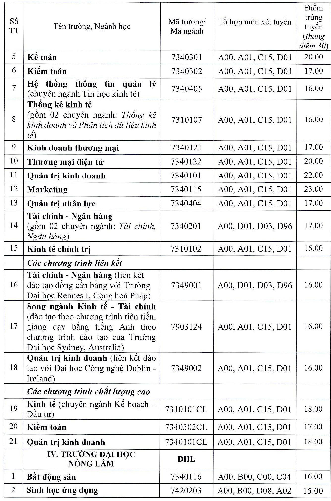Trường ĐH Kinh tế: Các ngành có mức điểm từ 16 - 23 điểm. Cao nhất là ngành Marketing với 23 điểm.