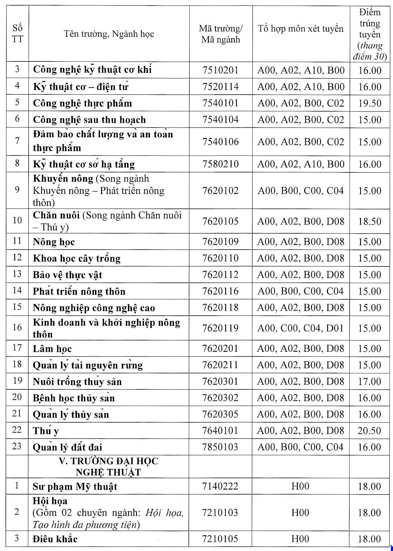 Tại trường ĐH Nông Lâm, mức điểm chuẩn các ngành từ 15 - 20,50 điểm, cao nhất là ngành Thú y (20,5 điểm). Các ngành thuộc trường ĐH Nghệ thuật đều có cùng mức điểm 18. Các ngành thuộc trường ĐH Sư phạm có mức điểm từ 15 - 24 điểm. Tại trường ĐH Khoa học, mức điểm chuẩn các ngành từ 15 - 17 điểm.