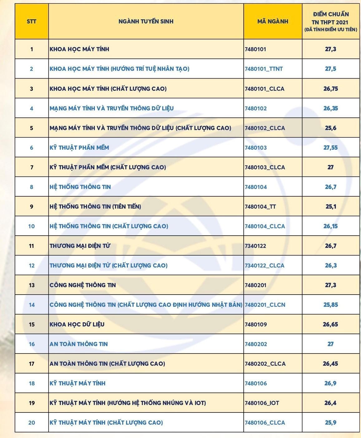 Nhìn chung, điểm chuẩn của trường năm nay tăng từ 1 - 3 điểm, tùy ngành, so với năm ngoái. Trong đó, điểm chuẩn ngành cao nhất là Kỹ thuật Phần mềm, với 27,55 điểm. Ngành thấp nhất là Hệ thống Thông tin (Chương trình tiên tiến) với 25,1 điểm.