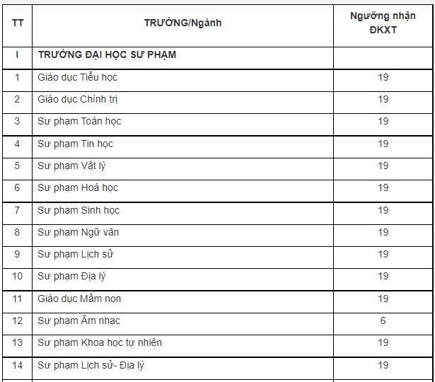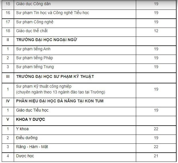 Theo đó, tại trường ĐH Sư phạm, ngoài ngành Giáo dục Thể chất 12 điểm, tất cả các ngành còn lại là 19 điểm. Trường ĐH Ngoại ngữ, trường ĐH Sư phạm Kỹ thuật và Phân hiệu ĐH Đà Nẵng tại Kon Tum cũng lấy 19 điểm. Khoa Y dược từ 19 - 22 điểm.