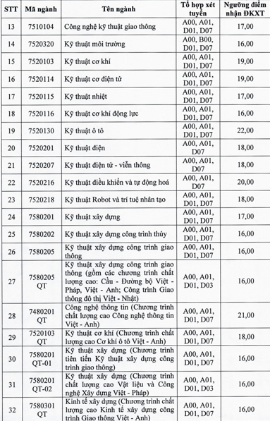 Các tổ hợp xét tuyển gồm A00, A01, B00, C01, D01, D03, D07, V00 và V01. Ngưỡng điểm nhận đăng ký xét tuyển là mức điểm tối thiểu của 3 môn theo tổ hợp xét tuyển cộng điểm ưu tiên nếu có. Riêng tổ hợp V00 và V01 điểm môn Vẽ kỹ thuật từ 5 trở lên.