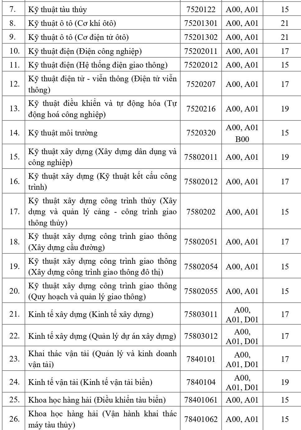 Theo đó, chương trình đại trà từ 15 -21 điểm. Có 6 ngành/chuyên ngành cùng 21 điểm là Công nghệ thông tin, Logistic và Quản lý Chuỗi cung ứng (Quản trị Logistic và Vận tải đa phương thức), Logistic và Quản lý Chuỗi cung ứng (Logistic và Quản lý Chuỗi cung ứng), Kỹ thuật Cơ khí (Cơ khí tự động), Kỹ thuật Ô tô (Cơ khí), Kỹ thuật Ô tô (Cơ điện).