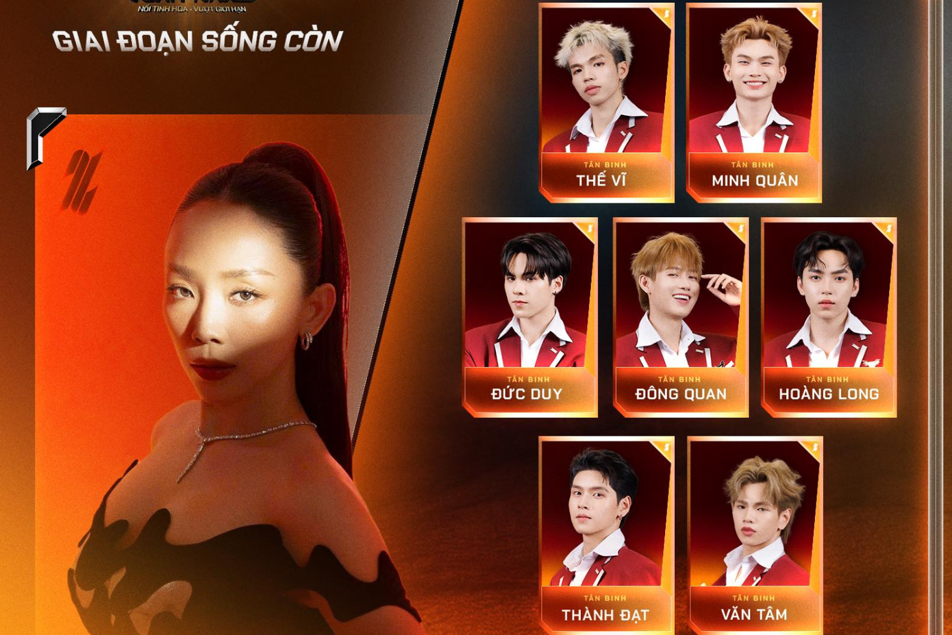 Trong khi đó, đội của "chị đẹp" Tóc Tiên gồm Lê Bin Thế Vĩ, Lê Phạm Minh Quân, Nguyễn Thành Đạt, Đặng Đức Duy, Hồ Đông Quan, Tạ Hoàng Long và Phạm Văn Tâm.
