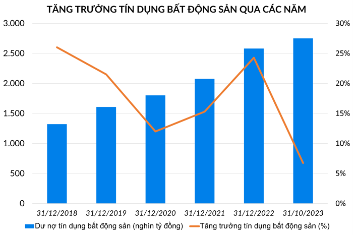 Ngân hàng Nhà nước (NHNN) công bố, tính đến cuối tháng 9/2023, tổng dư nợ tín dụng đối với lĩnh vực bất động sản (BĐS) đạt khoảng 2,75 triệu tỷ đồng (chiếm 21,51% tổng dư nợ nền kinh tế), tăng 6,75% so cuối 2022.