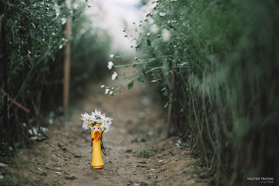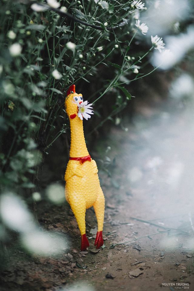 Mới đây, cư dân mạng được phen cười nghiêng ngả trước bộ ảnh của một anh chàng nhiếp ảnh gia… “ế khách”. Tự nhận trên bài chia sẻ của mình rằng do chụp xấu nên không tuyển được ai làm người mẫu ảnh, nhưng vì quá yêu thích chụp ảnh nên anh chàng có tài khoản Facebook là NGuyễn Trường đã quyết định vác theo một con gà nhựa “thần thánh” đến cánh đồng hoa cúc hoạ mi để làm mẫu cho mình.