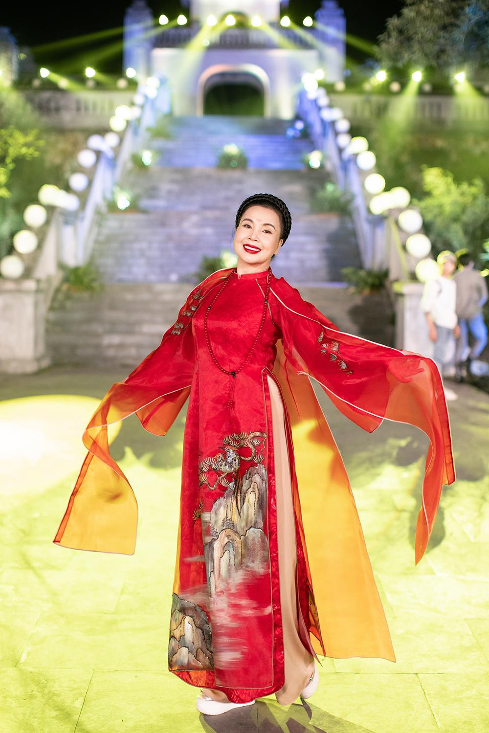 NSND Lan Hương diện bộ áo dài bay bổng tông màu đỏ với những họa tiết độc đáo. Trong cảnh sắc của vùng đất Yên Tử, diễn viên ‘Em bé Hà Nội’ hòa mình vào âm nhạc để thể hiện trọn vẹn màn trình diễn.