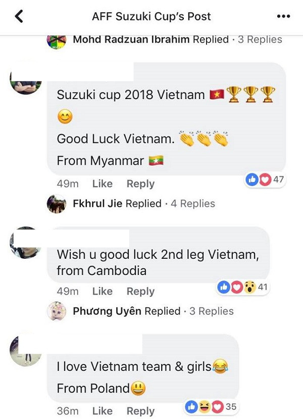 Ngay sau khi trận đấu kết thúc, rất nhiều fan hâm mộ bóng đá Đông Nam Á đã chia sẻ sự ủng hộ với đội tuyển Việt Nam. Đại đa số đều cho rằng Việt Nam đã có một trận đấu tốt, lối chơi đẹp và rất xứng đáng giành ngôi vô địch của AFF Suzuki Cup 2018.