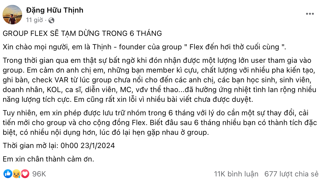 Thế nhưng vào khuya 20/7, người sáng lập group Flex đến hơi thở cuối cùng - Facebooker Đặng Hữu Thịnh bất ngờ đăng tải dòng thông báo "Group sẽ tạm dừng trong 6 tháng".