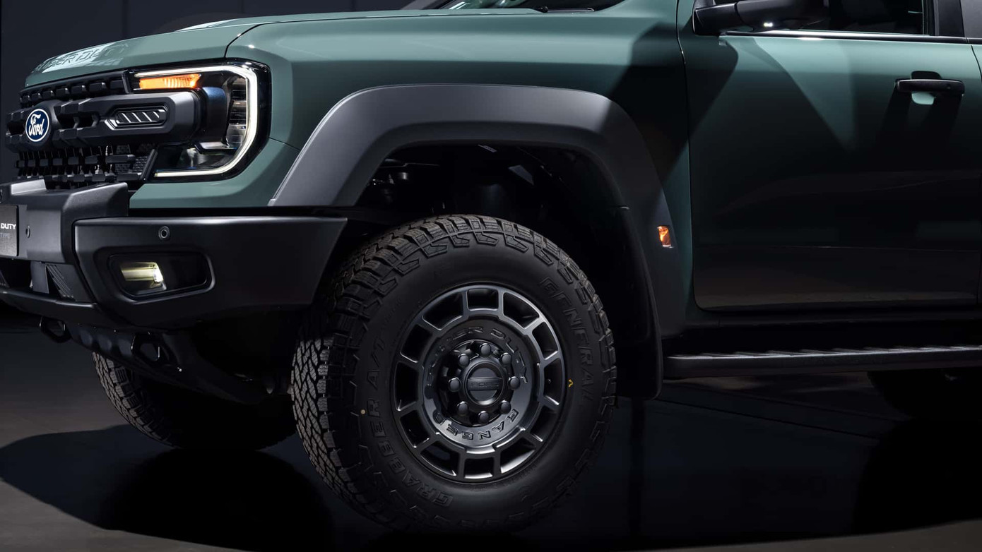 Xe sử dụng bộ mâm 8 lỗ đi kèm bu lông dày hơn, giúp chịu tải nặng tốt hơn. Lốp địa hình 33 inch có thiết kế khá giống với bản Ranger Raptor. Bên cạnh đó, khoảng sáng gầm xe cùng chiều dài trục cũng được tăng lên, vừa tăng hiệu quả off-road vừa khiến ngoại hình của Ranger Super Duty trở nên hầm hồ hơn.