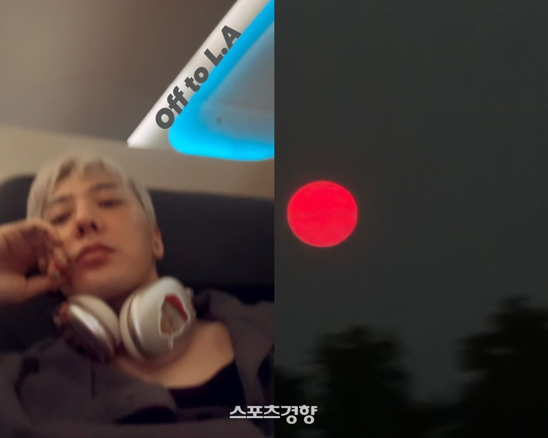 Vào ngày 29/5, G-Dragon đã đăng một bức ảnh tự sướng chụp trên ghế máy bay với cụm từ "Off to L.A." trên story SNS của mình. Ánh sáng xanh trong bức ảnh tạo nên cảm giác tình cảm, nhưng anh đã nhanh chóng thêm một bức ảnh bầu trời tối với mặt trời đỏ.