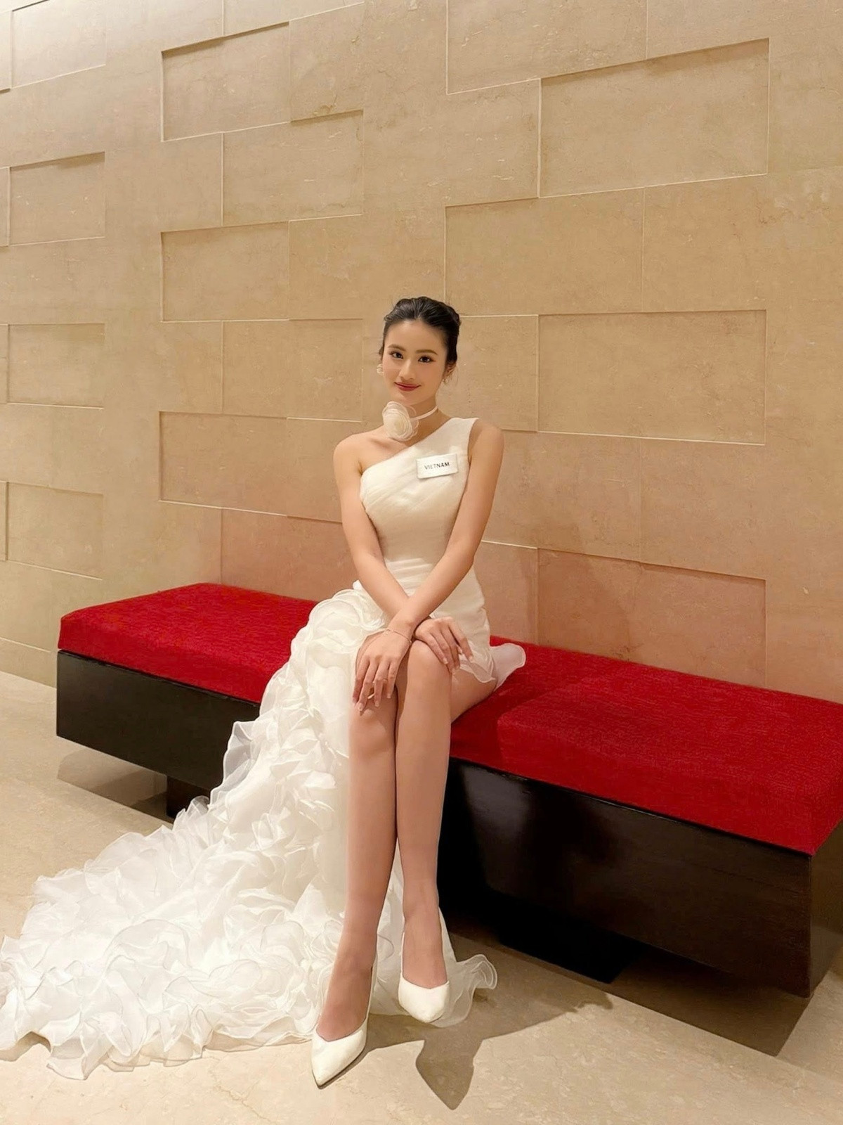 Trong ngày tiếp theo, Ý Nhi đổi phong cách với thiết kế váy dài bất đối xứng, xinh đẹp như một nàng thiên nga trắng muốt. Thiết kế với chân váy high-low giúp khoe trọn đôi chân dài của người đẹp.