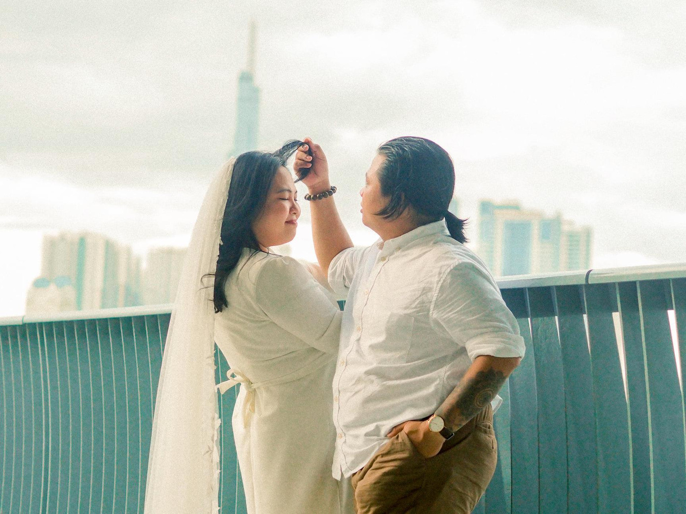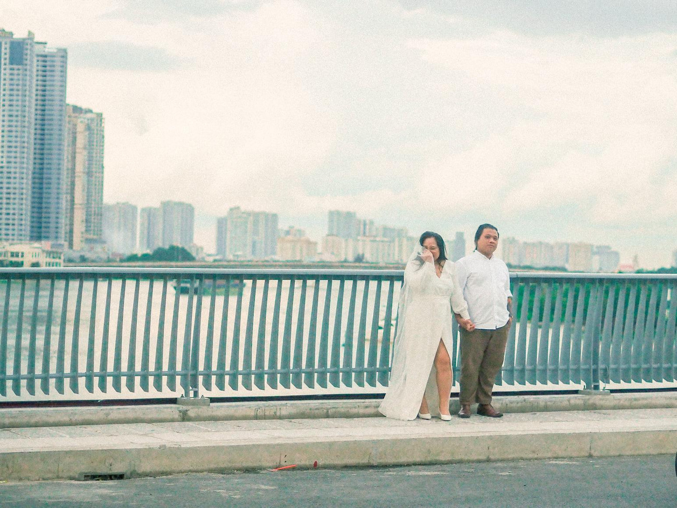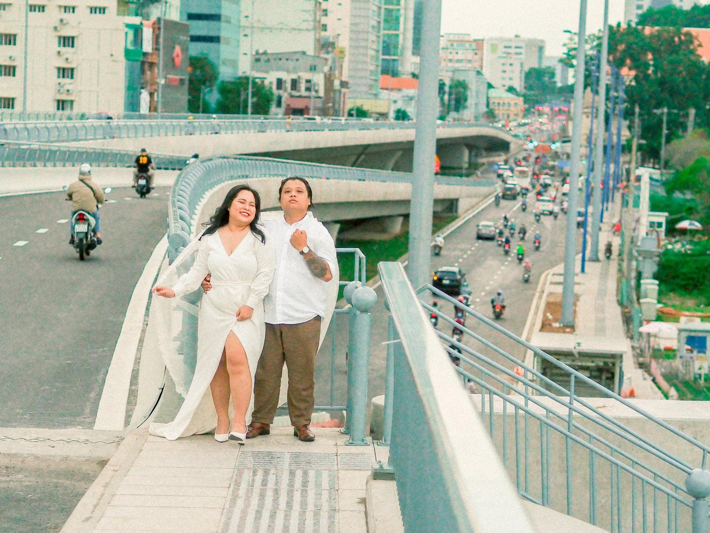 Cô dâu mới không giấu được vẻ ngạc nhiên trước vẻ đẹp của thành phố từ một góc nhìn mới: "Từ trên cầu Thủ Thiêm 2 nhìn xuống Sài Gòn rất đẹp, cả hai bên cầu và view xung quanh cũng 'hết nước chấm'! Những lúc có du thuyền về bến hoặc Waterbus chạy ngang còn đẹp 'dữ dội' hơn nữa. Đó đều là những khoảnh khắc chưa bao giờ có trong những tấm hình về Sài Gòn và là lần đầu tiên mình chụp nên cảm thấy rất đẹp, rất hiện đại. Chính điều này khiến cho bộ ảnh cưới của mình mang một phong cách urban - hình cưới thành thị nên mình rất thích".