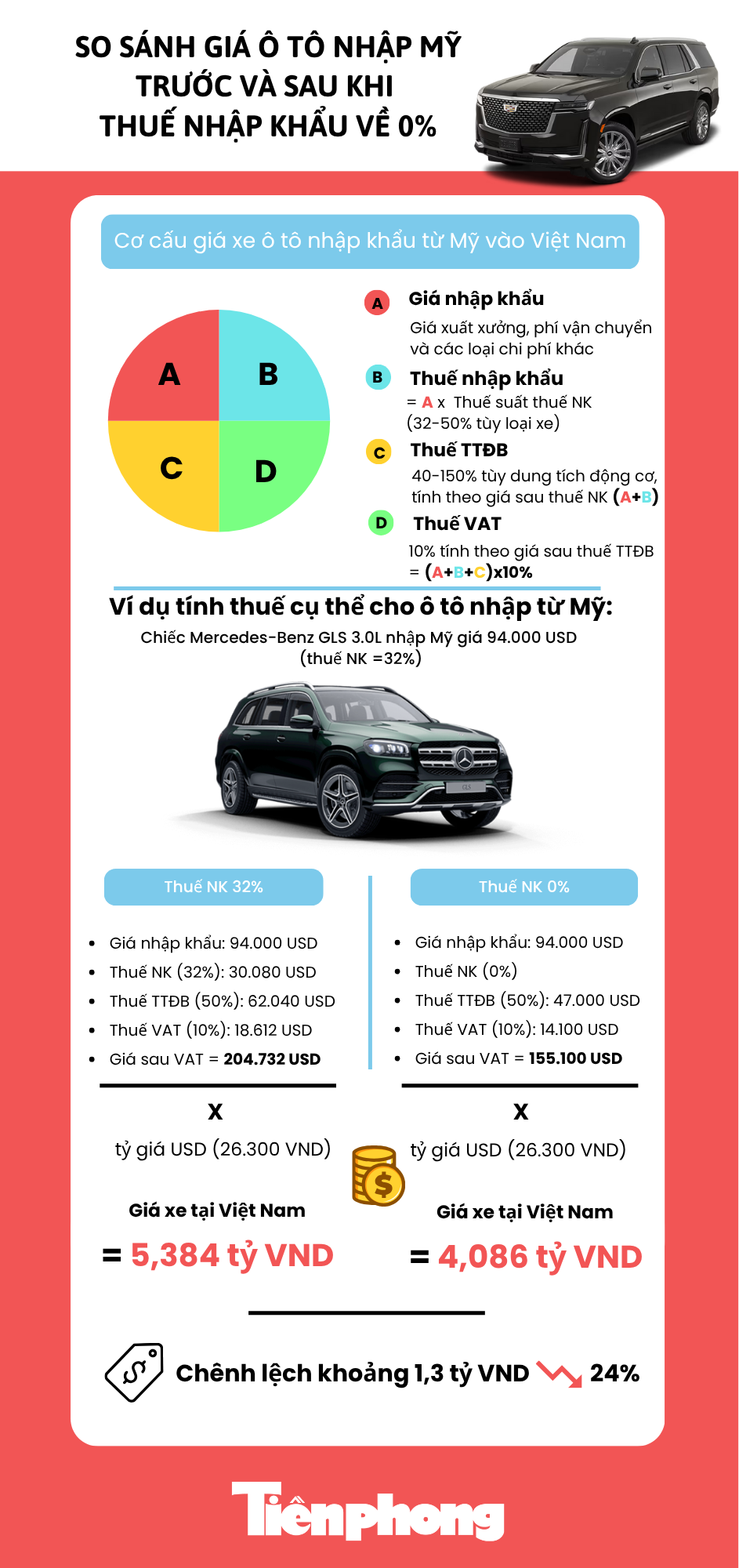 TPO - Khi ô tô từ Mỹ hưởng ưu đãi 0% thuế nhập khẩu (một số loại thuế khác vẫn duy trì), theo tính toán, giá bán các mẫu xe có thể giảm từ 20 đến 30% tùy kiểu loại. Ví dụ, chiếc Mercedes-Benz GLS 3.0L sẽ giảm khoảng 1,3 tỷ đồng, tương đương 24% so với giá cũ.