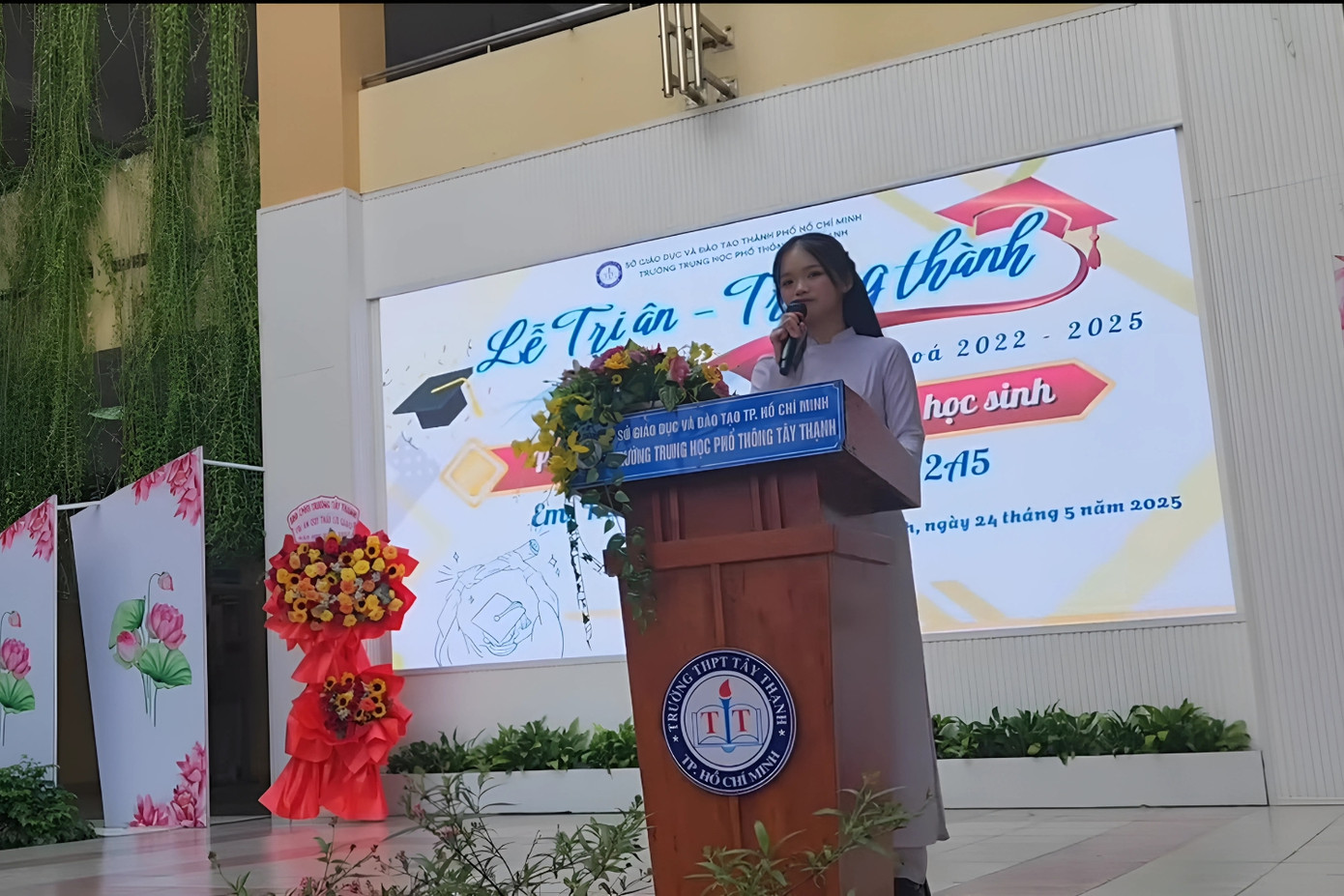 Trước đó, tại buổi Lễ Tri ân và Trưởng thành dành cho học sinh khối 12 (niên khóa 2022-2025), bạn Thái Mạc Tường Vi đã có bài chia sẻ xúc động về những khó khăn mà em đang đối mặt. Câu chuyện của nữ sinh đã nhận được sự đồng cảm lớn từ cộng đồng.