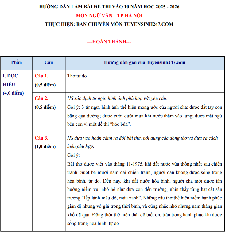 Dưới đây là gợi ý đáp án của các giáo viên Tuyensinh247 để phụ huynh và thí sinh tham khảo. Đáp án chính thức của Sở GD&ĐT Hà Nội sẽ được công bố sau.