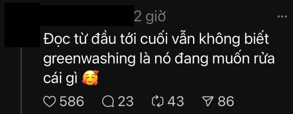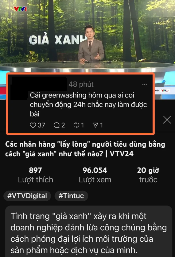 Netizen cũng phát hiện ra sự trùng hợp thú vị khi bản tin Chuyển động 24h của VTV hôm qua đã đề cập tới khái niệm này với từ Việt hóa là "giả xanh". Cụ thể, greenwashing được xem là tình trạng "giả xanh" khi doanh nghiệp đánh lừa công chúng bằng cách phóng đại lợi ích môi trường của sản phẩm hoặc dịch vụ của mình.
