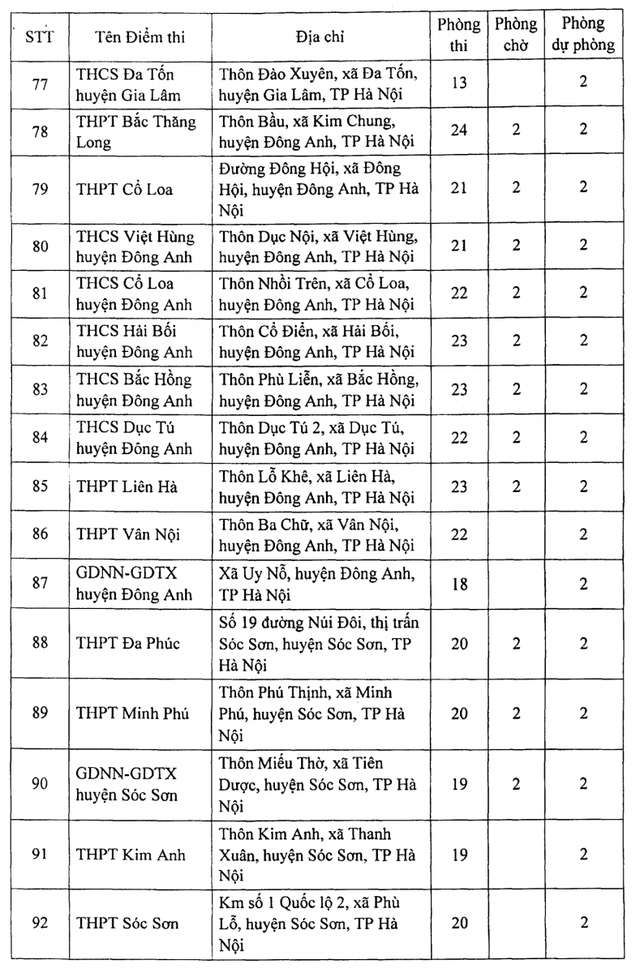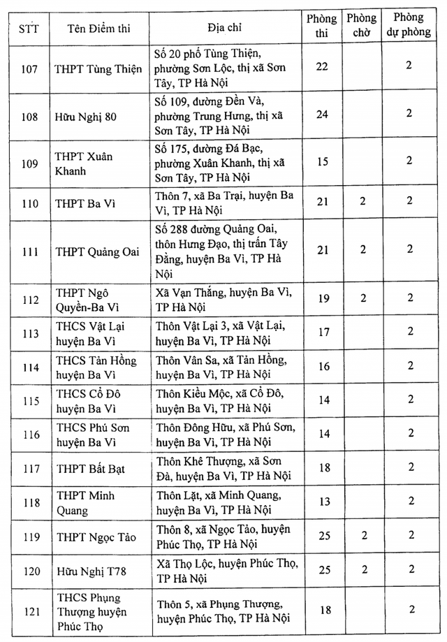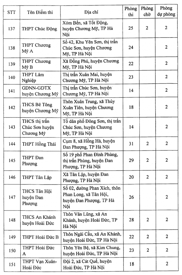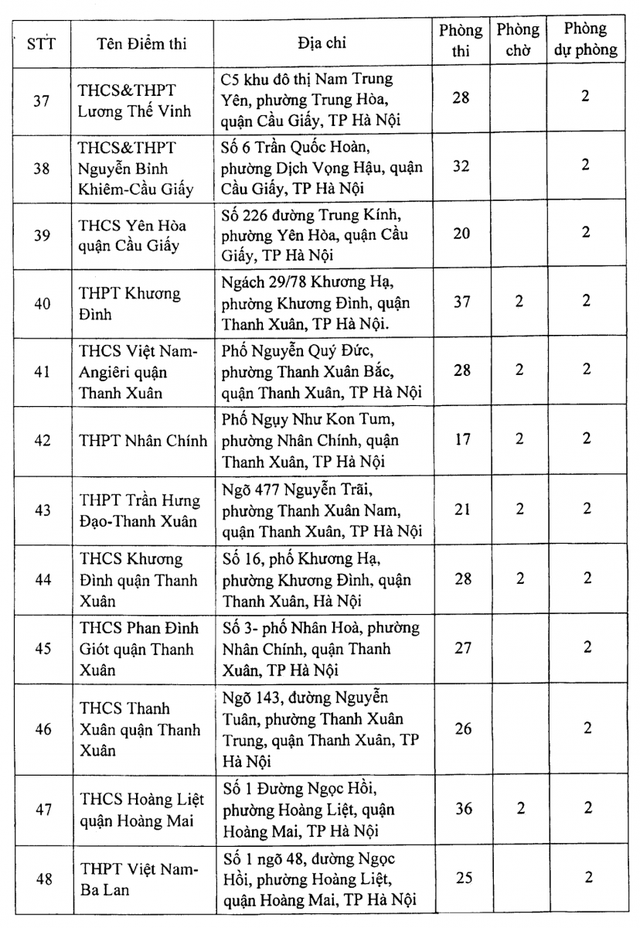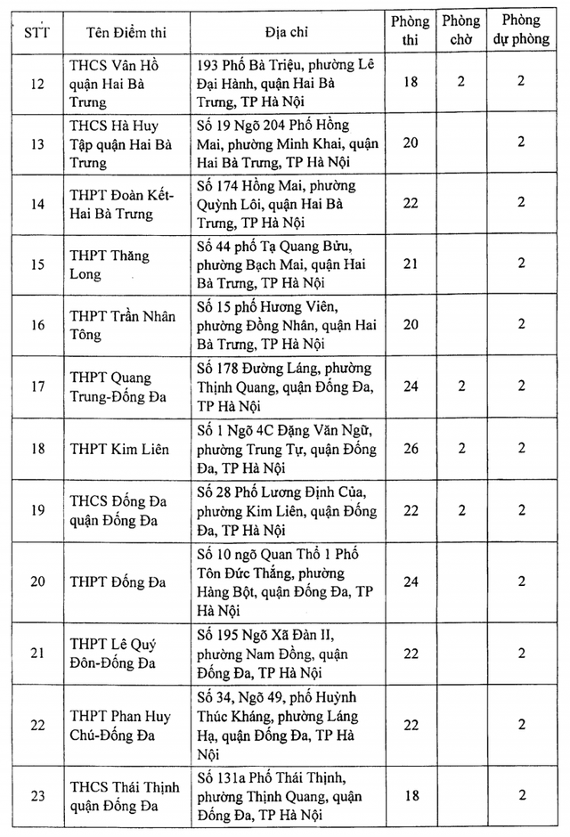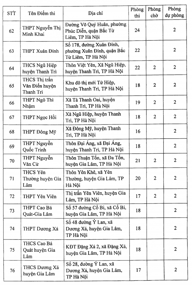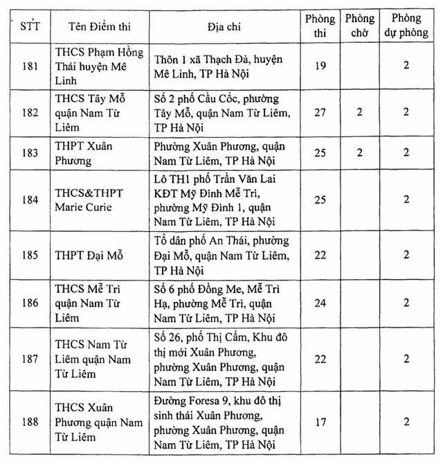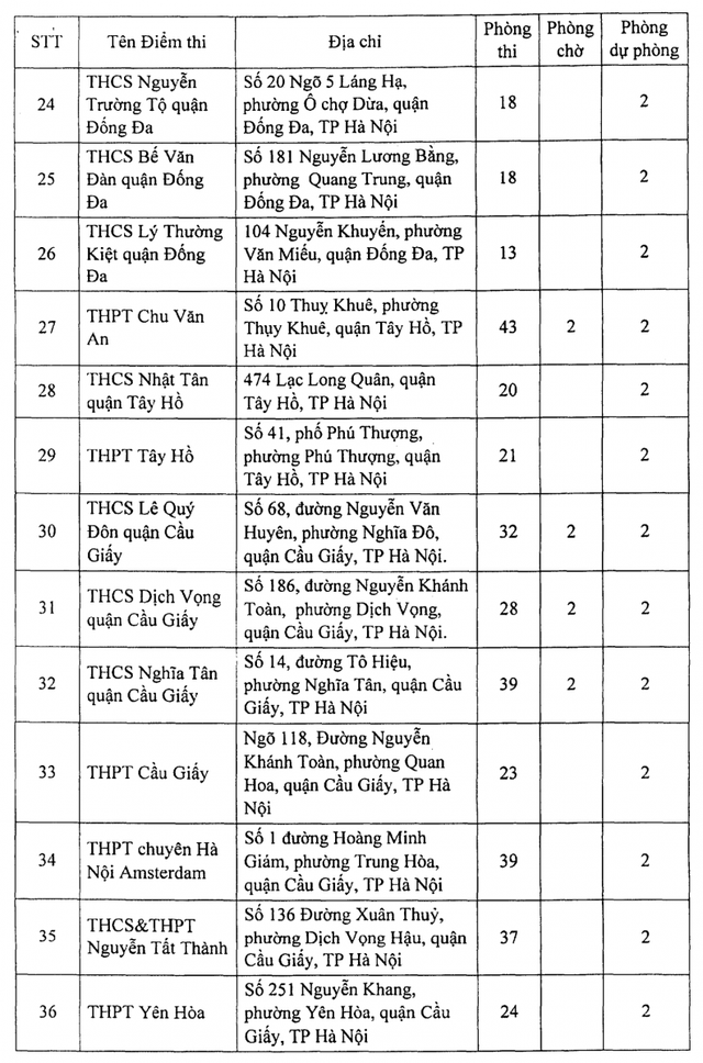Toàn thành phố có 188 điểm thi, điểm thi lớn nhất là THCS Trưng Vương với 45 phòng thi, tiếp theo là THPT Chu Văn An với 43 phòng thi.