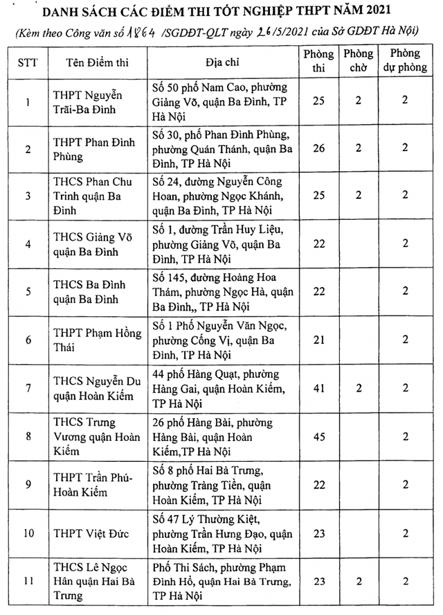 HHTO - Sở GD&ĐT Hà Nội vừa công bố 188 địa điểm thi tốt nghiệp THPT năm 2021. Theo đó, tất cả địa điểm thi đều có 2 phòng thi dự phòng, nhiều điểm thi bố trí thêm 2 phòng chờ.