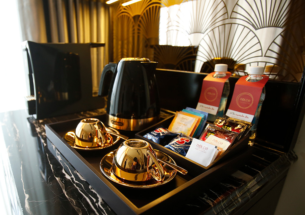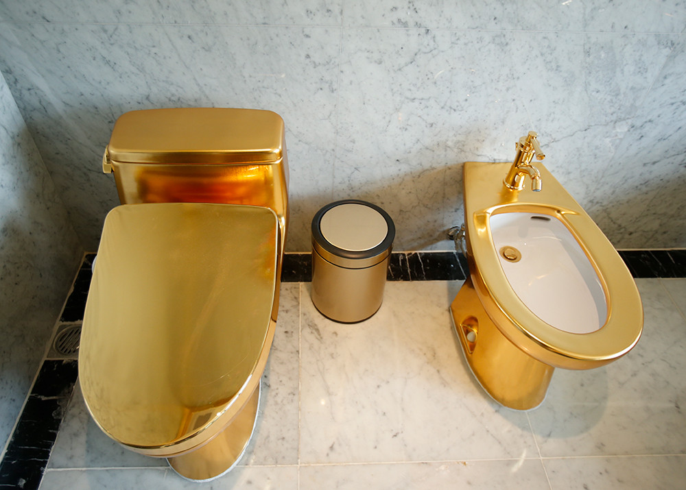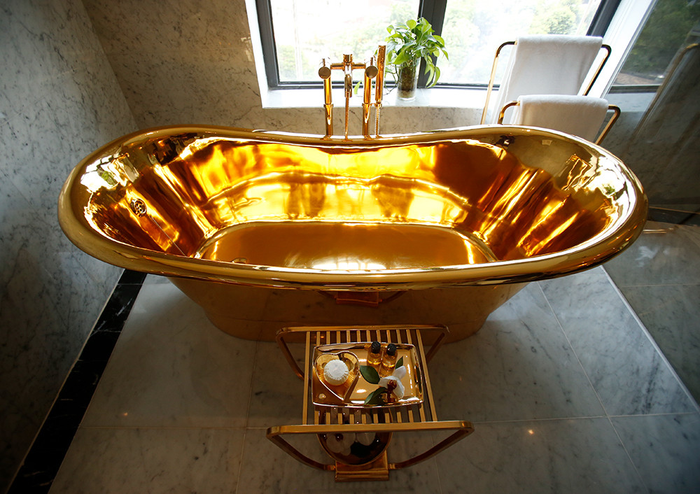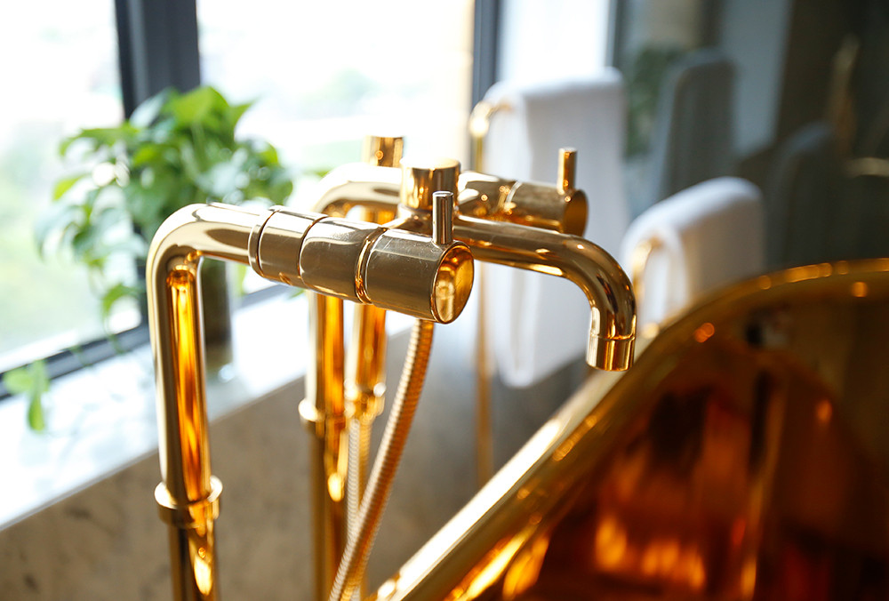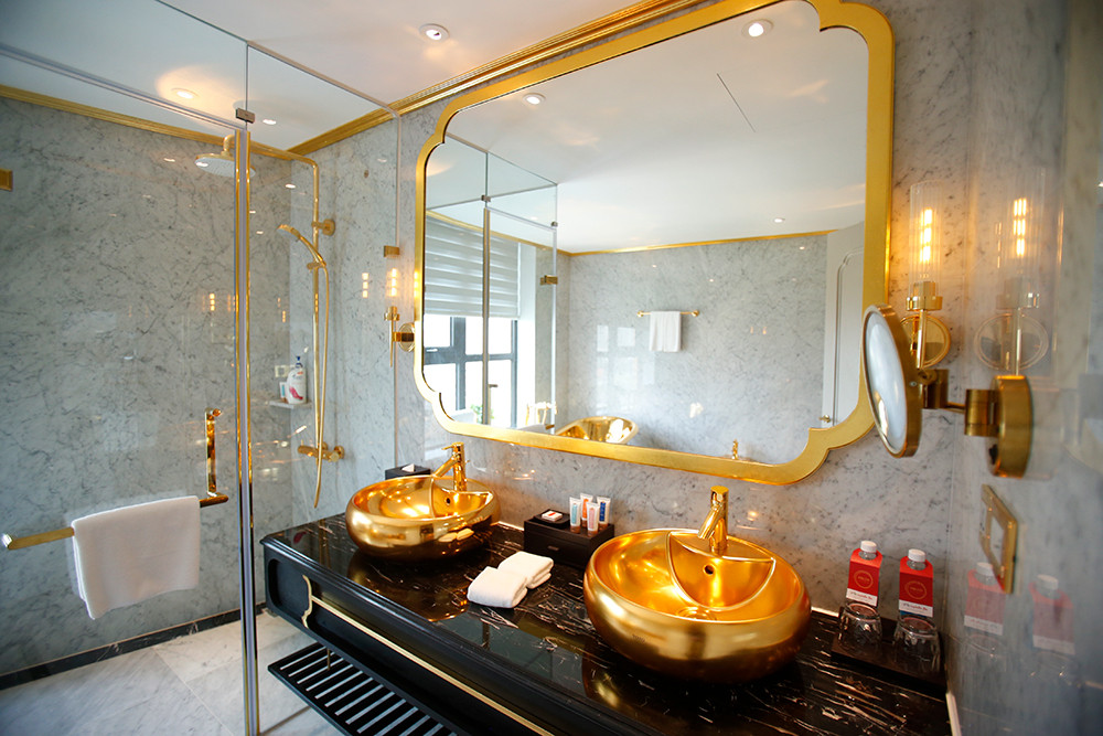 Bên trong tòa nhà, toàn bộ các thiết bị vệ sinh, bồn tắm, sen vòi vệ sinh…đều được phủ vàng 24K. Có thể nói đây là những sản phẩm rất độc đáo. Tháng 12/2018 chúng tôi sang Dubai triển lãm các thiết bị mạ vàng này và nhiều người Ả Rập đã chụp ảnh và đăng trên báo địa phương nói rằng “Thánh đã chạm tay vào thiết bị nội thất ngôi nhà của bạn”. Người Trung Đông có truyền thuyết là có vị thánh hễ chạm tay vào vật gì thì cái đó biến thành vàng. Người thợ Việt Nam đã làm được những sản phẩm dát vàng tuyệt vời như vậy. Dự kiến tháng 12/2020 chúng tôi sẽ mang sản phẩm gạch phủ vàng ngoạt thất tòa nhà và một số thiết bị khác triển lãm tại Dubai.