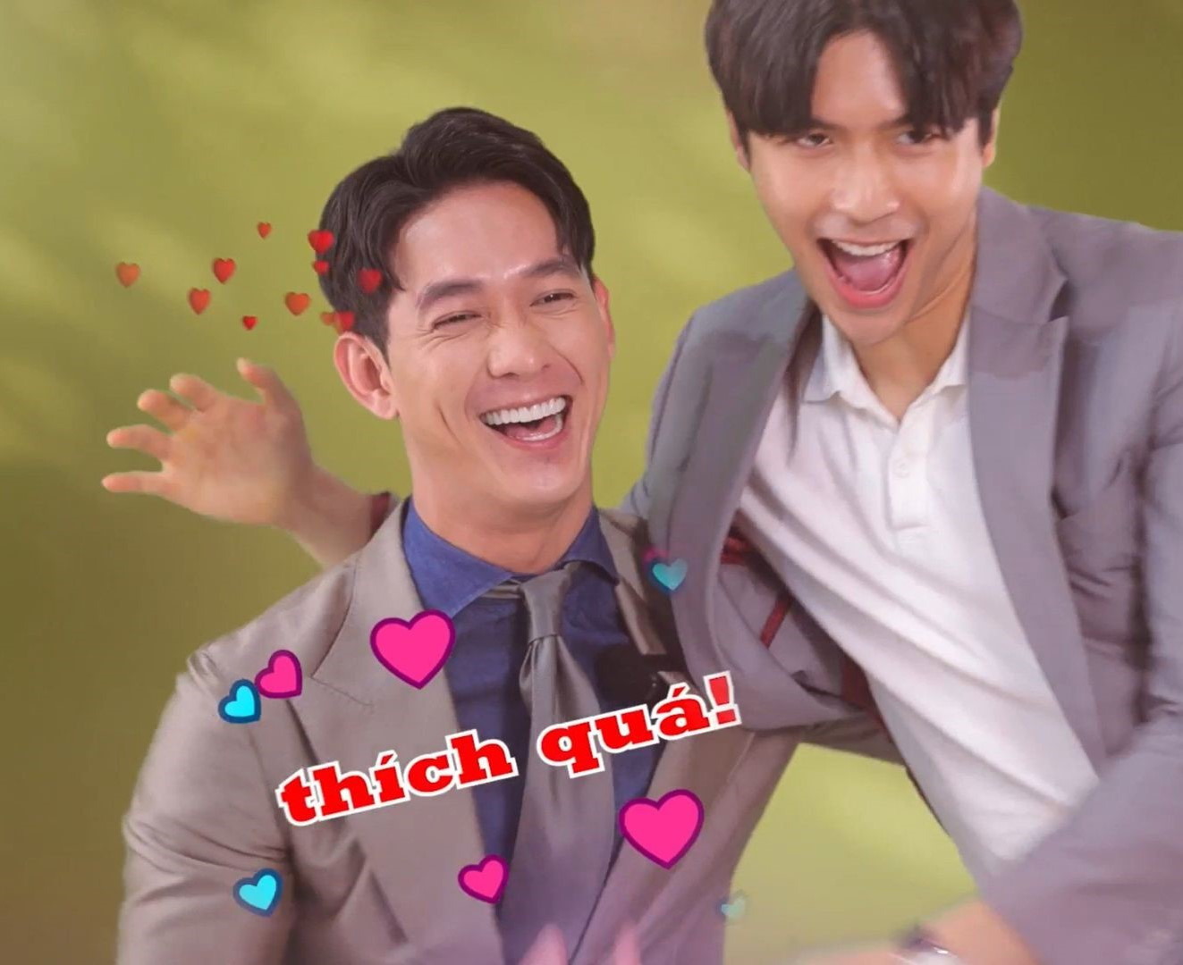 Không từ chối hay có hành động né tránh, nam diễn viên thích thú ôm lại, cười thật tươi và nói: “Thật ra thì đó, Quốc Anh mới là người mình hướng tới”.