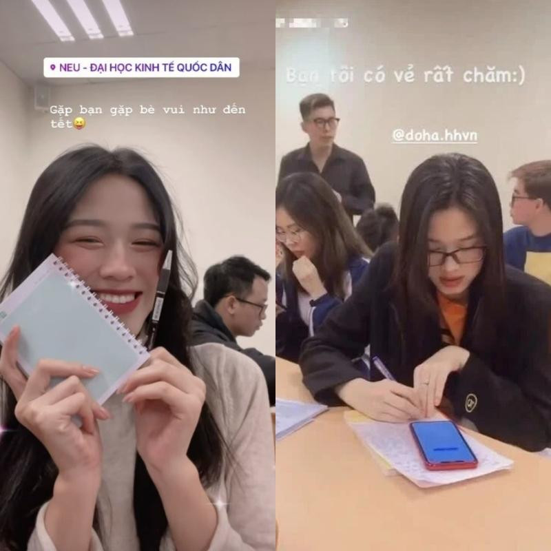 Ở trên giảng đường, đương kim Hoa hậu Việt Nam cũng rất giản dị, hòa đồng với bạn bè. Dù rất bận rộn với lịch trình của một Hoa hậu nhưng Đỗ Thị Hà vẫn dành thời gian ôn tập bài vở, cố gắng không bỏ lỡ kỳ thi cuối kỳ. Nhờ tinh thần chăm chỉ này mà 'nàng Hậu' ngày càng được lòng khán giả hơn.