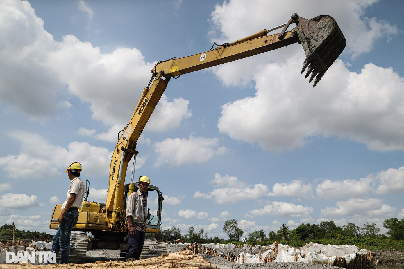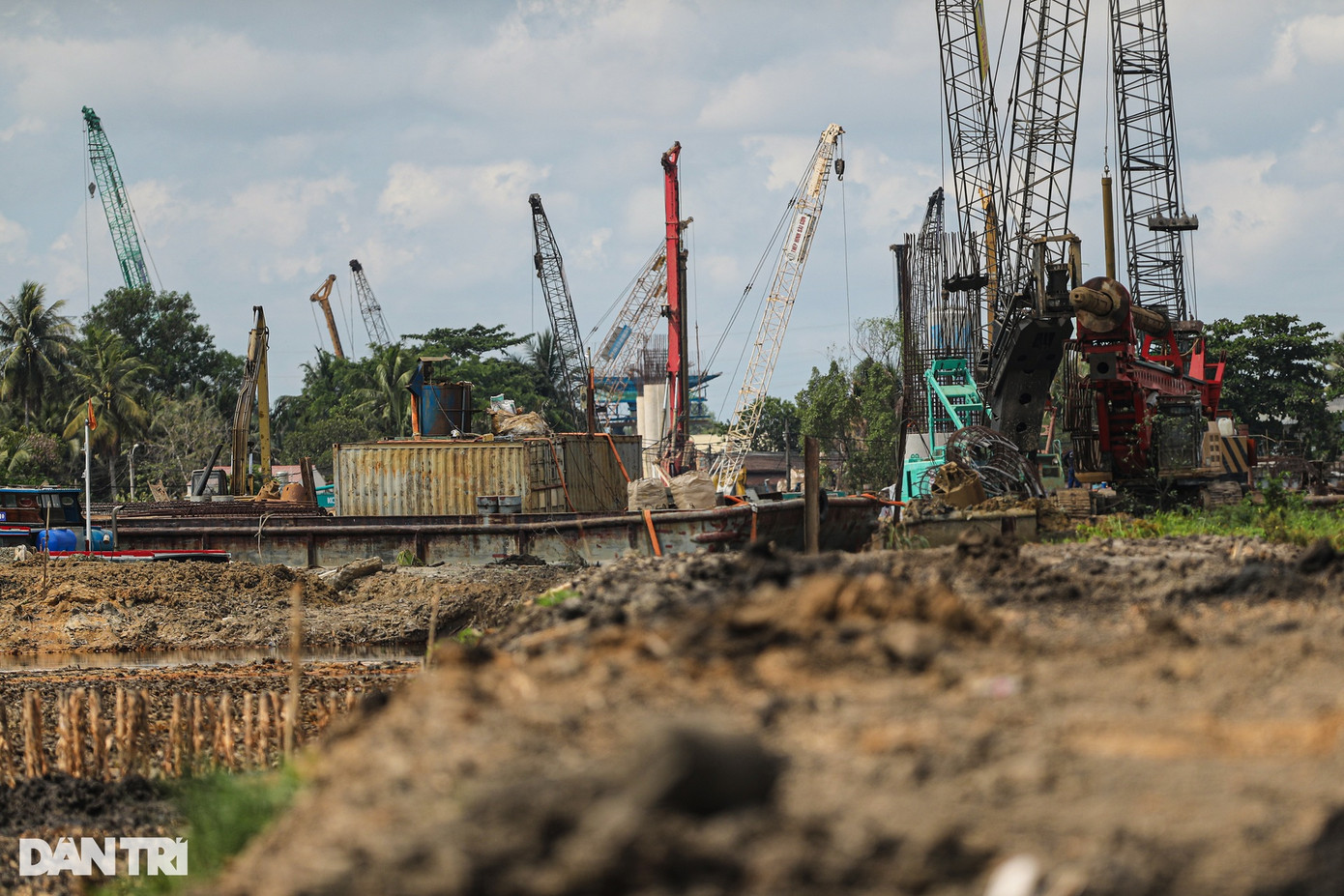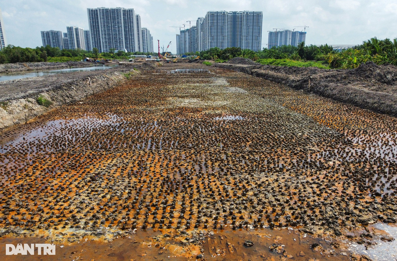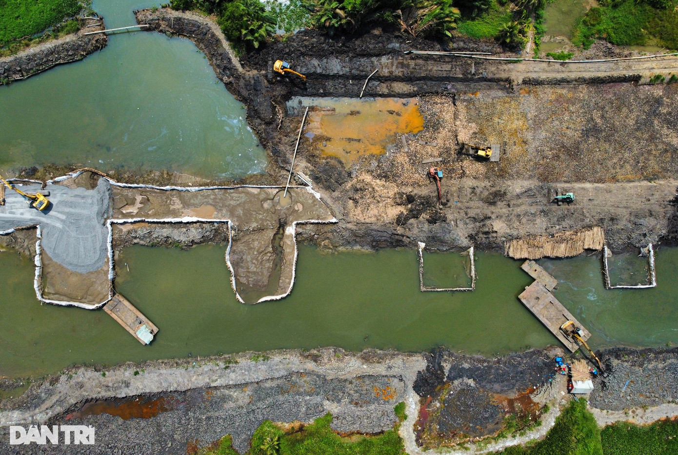 Toàn bộ đoạn đường này đã được đào vét hữu cơ, đắp bờ bao, đóng hoàn thiện phần cọc cừ tràm, hiện chỉ chờ cát đắp nền để thi công tiếp.