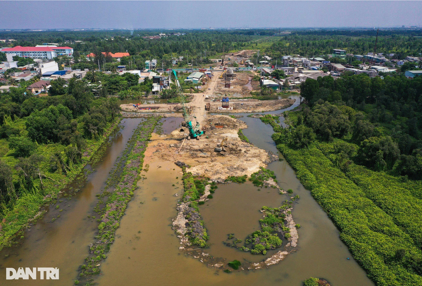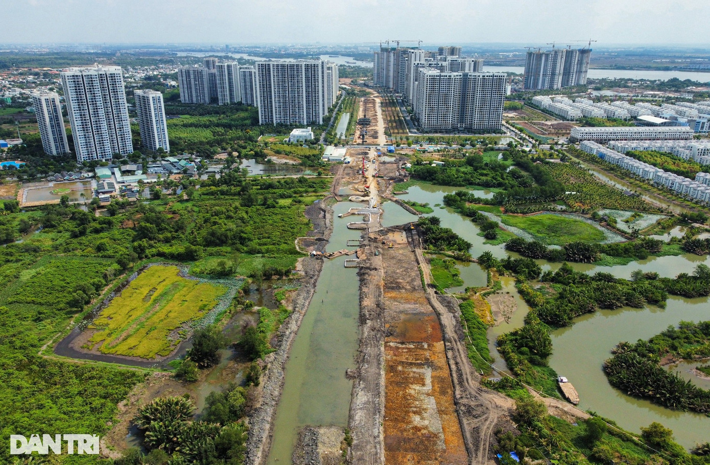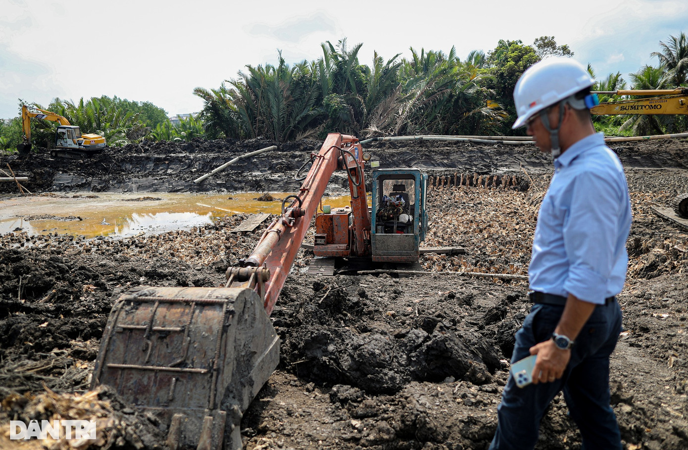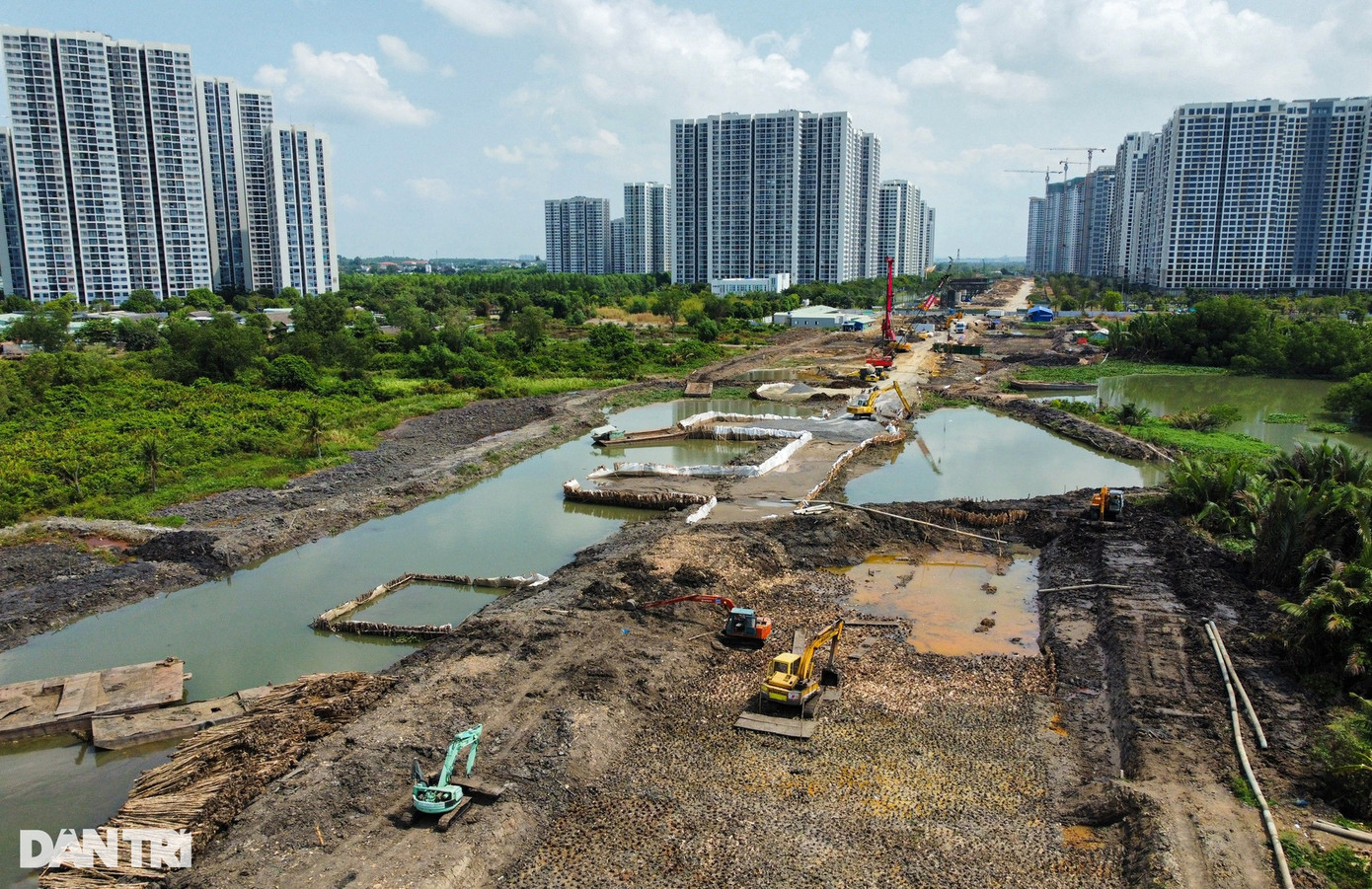 Toàn bộ đoạn đường này đã được đào vét hữu cơ, đắp bờ bao, đóng hoàn thiện phần cọc cừ tràm, hiện chỉ chờ cát đắp nền để thi công tiếp.
