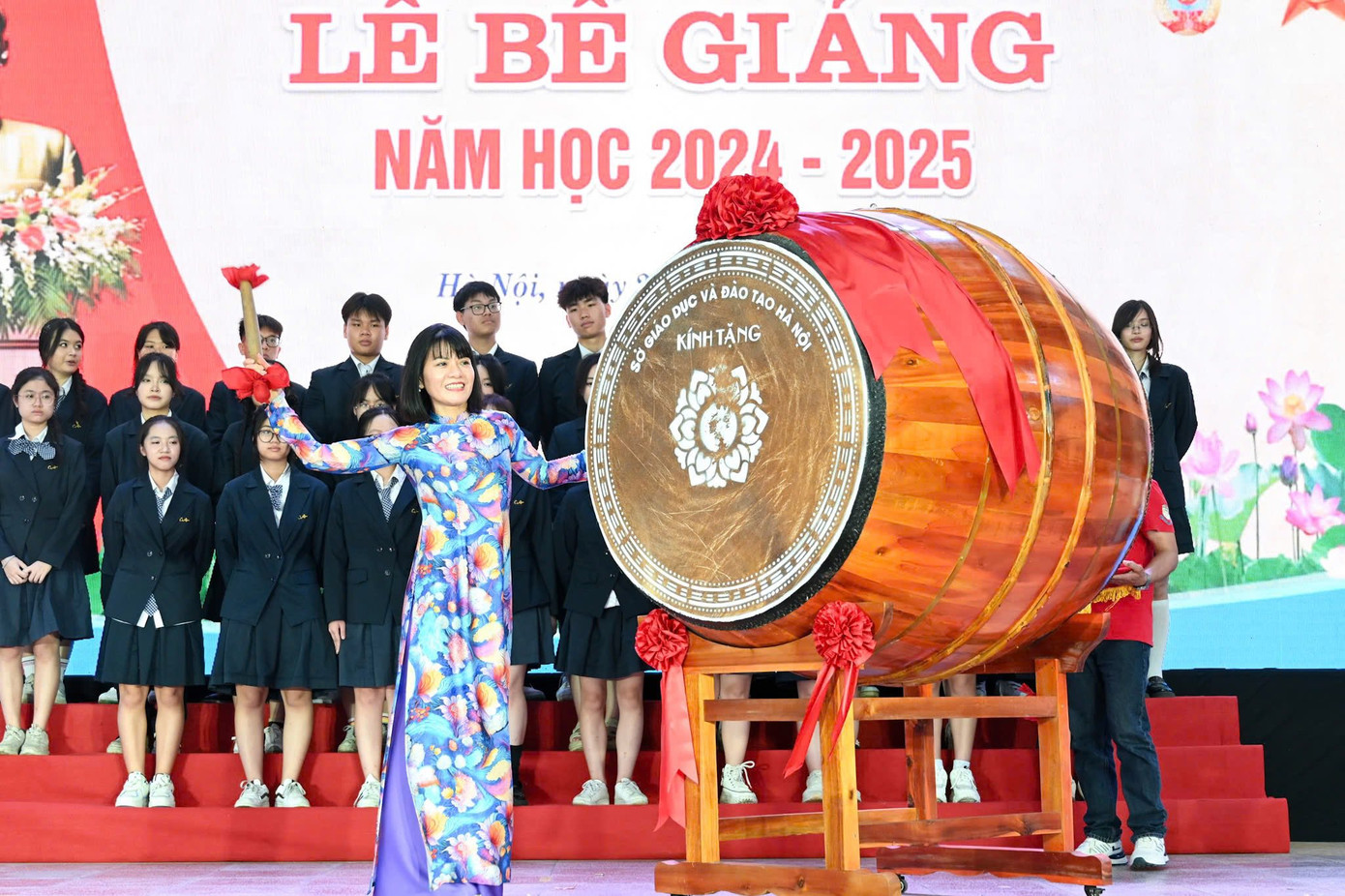 Phần lễ được mở đầu bằng nghi thức tri ân cha mẹ và thầy cô. Những cái ôm, những lời cảm ơn và cả những giọt nước mắt đã lặng lẽ rơi. Dưới ánh đèn vàng, những lời nhắn gửi được đọc vang lên, mộc mạc nhưng tha thiết, như lời chia tay dịu dàng của những học trò tại trường Bưởi dành cho “người lái đò”.