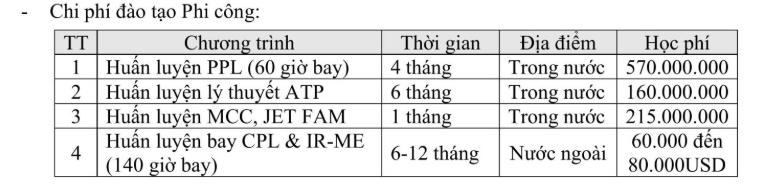 MCC & Jet FAM (phối hợp tổ bay và làm quen máy bay phản lực, 1 tháng): khoảng 215 triệu đồng; CPL & IR-ME (giấy phép phi công thương mại và bay thiết bị đa động cơ, 140 giờ bay): huấn luyện tại nước ngoài từ 6 - 12 tháng, chi phí dao động 60.000 - 80.000 USD (tương đương 1,5 - 2 tỉ đồng).