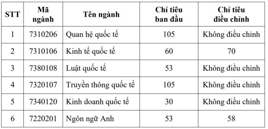 Ngoài ra, Học viện Ngoại giao điều chỉnh chỉ tiêu tuyển sinh đối với từng ngành trong phương thức xét tuyển dựa trên kết quả Kỳ thi tốt nghiệp THPT, cụ thể như sau: