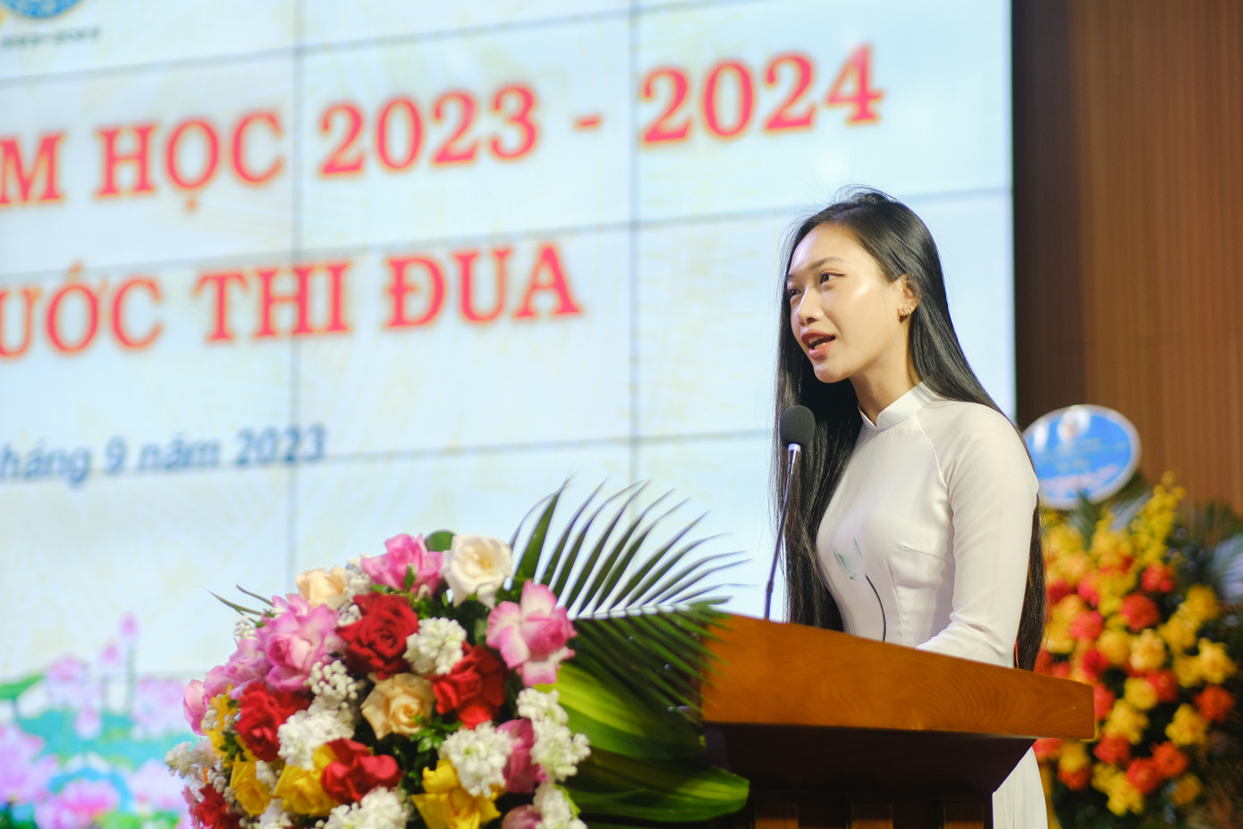 Sinh viên Vũ Thị Ngọc – Chủ tịch Hội Sinh viên Học viện Tài chính, đại diện cho sinh viên của Học viện bày tỏ sự quyết tâm thực hiện tốt các mục tiêu, nhiệm vụ trọng tâm của năm học mới 2023 – 2024; phát huy sâu sắc hơn nữa thông điệp mạnh mẽ của Đoàn Thanh niên, Hội Sinh viên Học viện Tài chính “Đưa Tài chính đi muôn nơi” khẳng định vị trí, vai trò, trách nhiệm của sinh viên Học viện