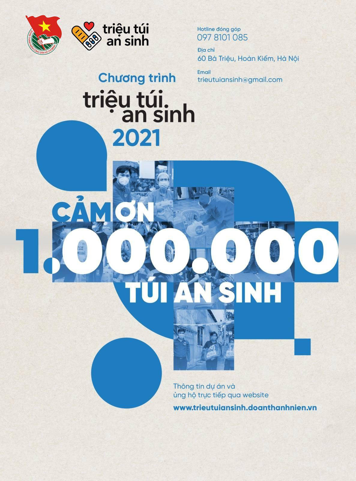 Theo thông tin từ Trung tâm Thông tin nguồn lực tình nguyện Việt Nam (cơ quan thường trực của T.Ư Đoàn trong triển khai chương trình “Triệu túi an sinh”), cho biết: Trong khuôn khổ chương trình, 875.774 “Túi quà an sinh” gồm lương thực, nhu yếu phẩm và 124.226 “Túi thuốc an sinh” đã được trao đến hơn 1 triệu người dân trên cả nước.