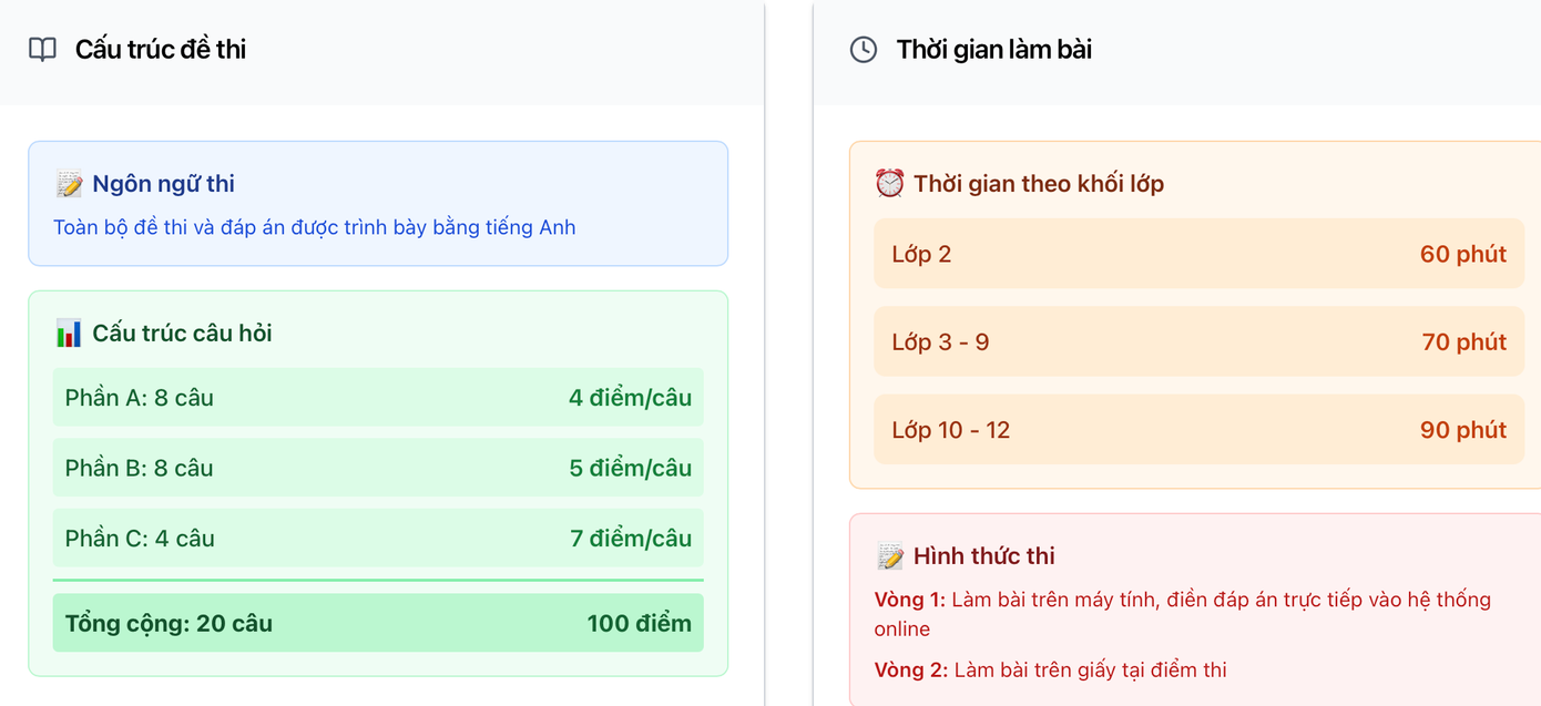 Nội dung đề thi AIMO được thiết kế theo chuẩn quốc tế, chia theo khối lớp phù hợp với độ tuổi. Các câu hỏi chú trọng vào khả năng suy luận, tư duy logic, phân tích tình huống và vận dụng kiến thức Toán học đã học vào thực tế.