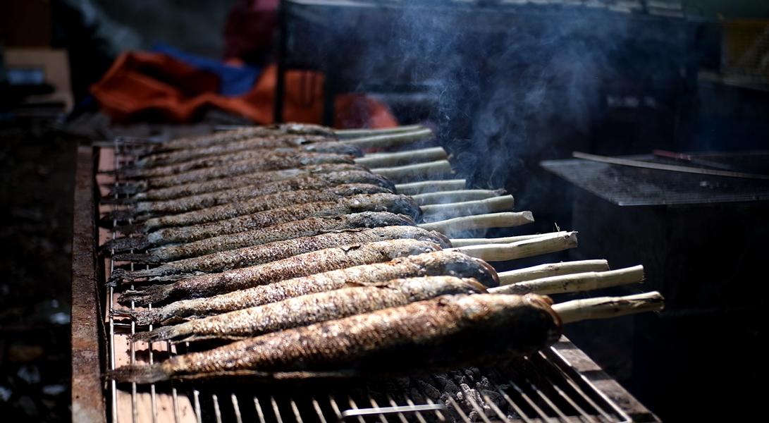 | Cá được xiên vào một cây mía nhỏ và nướng trên lửa than khoảng 25-30 phút cho chín vàng sẫm lớp vỏ ngoài. Cá nướng xong sẽ dùng dao cạo hết lớp than. |