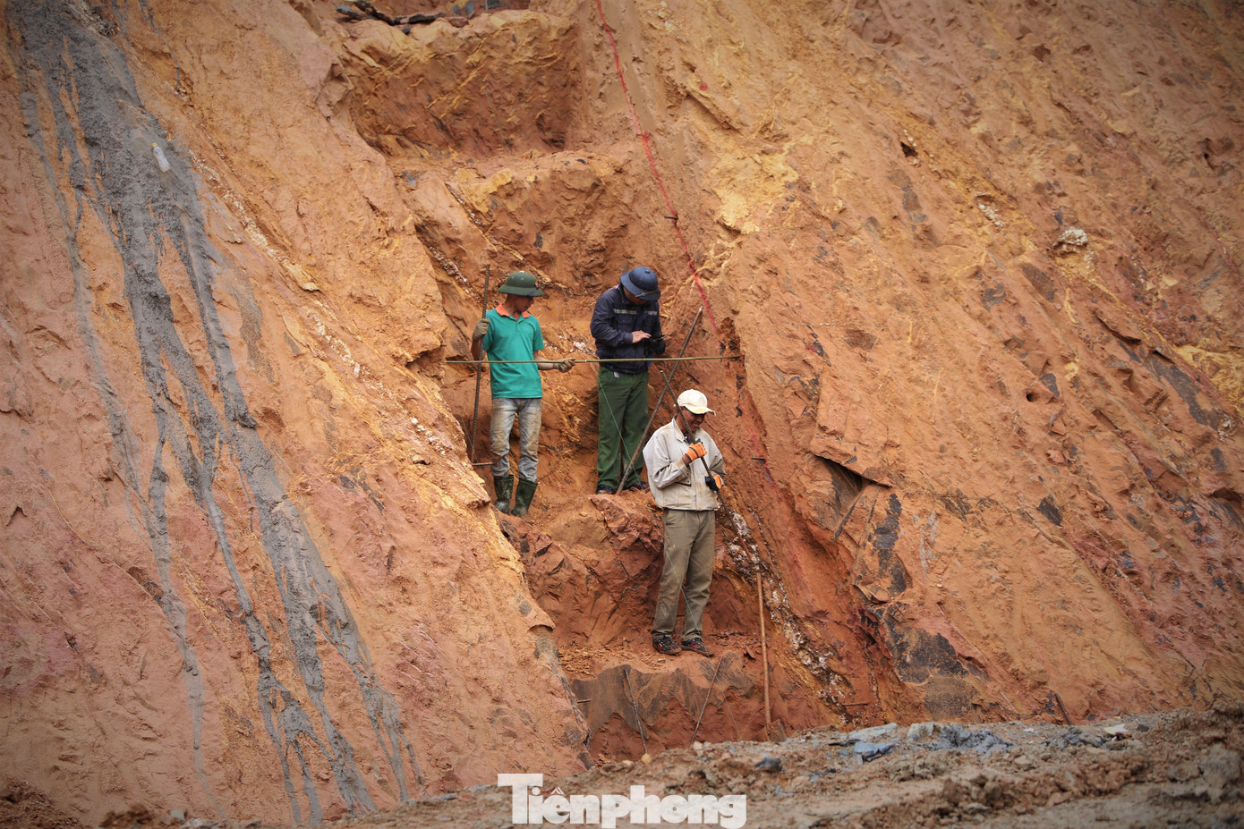 | Trước khi tiến hành khoan, nhà thầu gia cố mái hầm, khoan bơm vữa cắm sắt neo mái taluy, tránh sụt trượt trong quá trình thi công. |