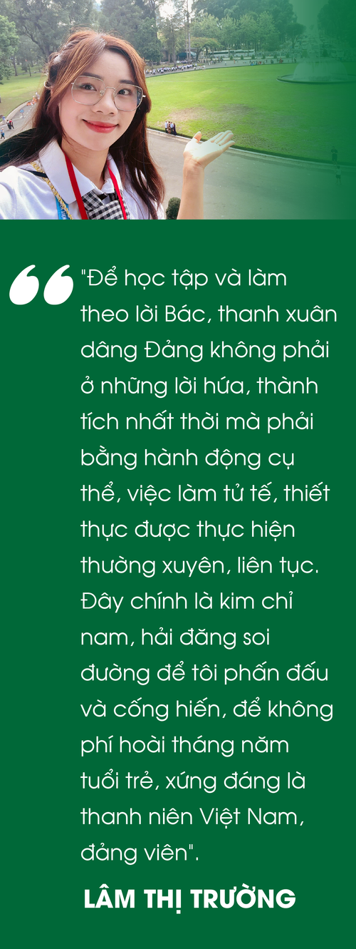 Lâm Thị Trường (SN 2003) là sinh viên ngành Giáo dục Tiểu học, Trường ĐH Hạ Long - Quảng Ninh. Cô được tin tưởng với nhiều trọng trách: Bí thư Liên Chi đoàn khoa Sư phạm khi là sinh viên năm nhất; Ủy viên BCH Đoàn trường, Uỷ viên BCH Hội Sinh viên tỉnh và Phó Chủ nhiệm CLB Sinh viên 5 tốt.