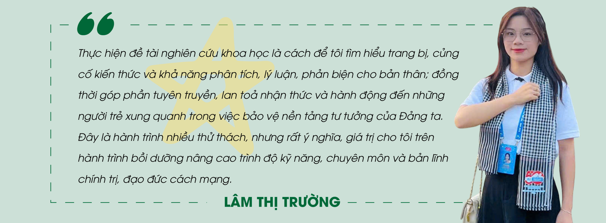 Góc học tập nơi ký túc xá của cô đêm khuya vẫn sáng ánh đèn soi những dòng Cương lĩnh chính trị, Văn kiện Đại hội XIII của Đảng, Nghị quyết số 35-NQ/TW của Bộ Chính trị về “Tăng cường bảo vệ nền tảng tư tưởng của Đảng, đấu tranh phản bác các quan điểm sai trái, thù địch trong tình hình mới”…; những bài viết phân tích, lý luận của chuyên gia đăng trên Tạp chí Cộng sản, Tạp chí Lý luận chính trị.