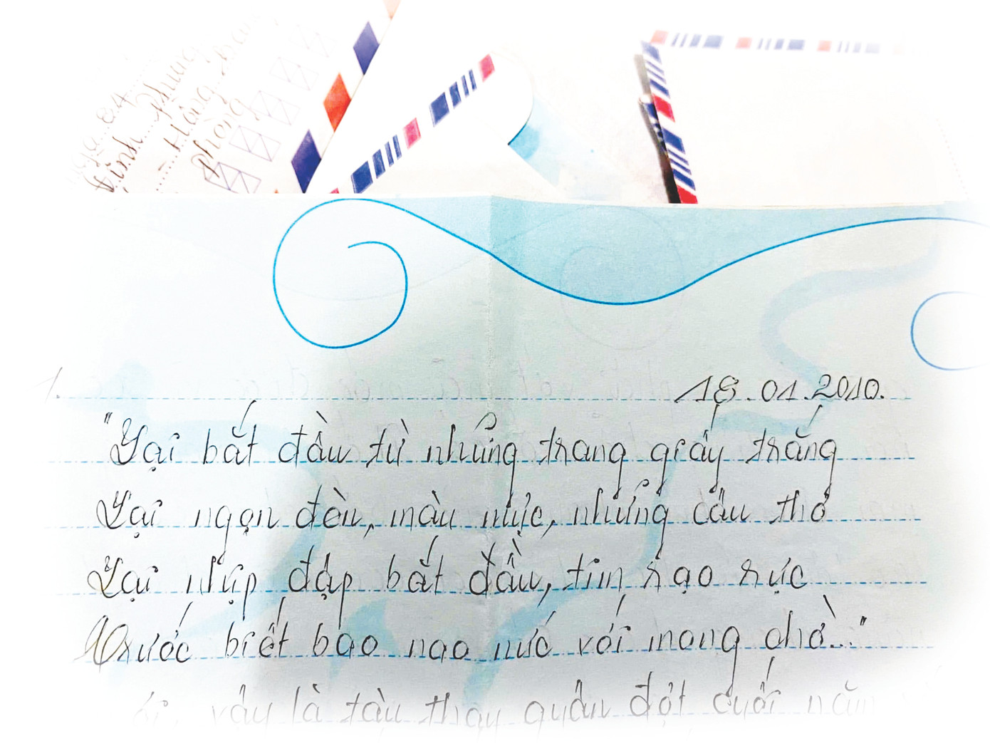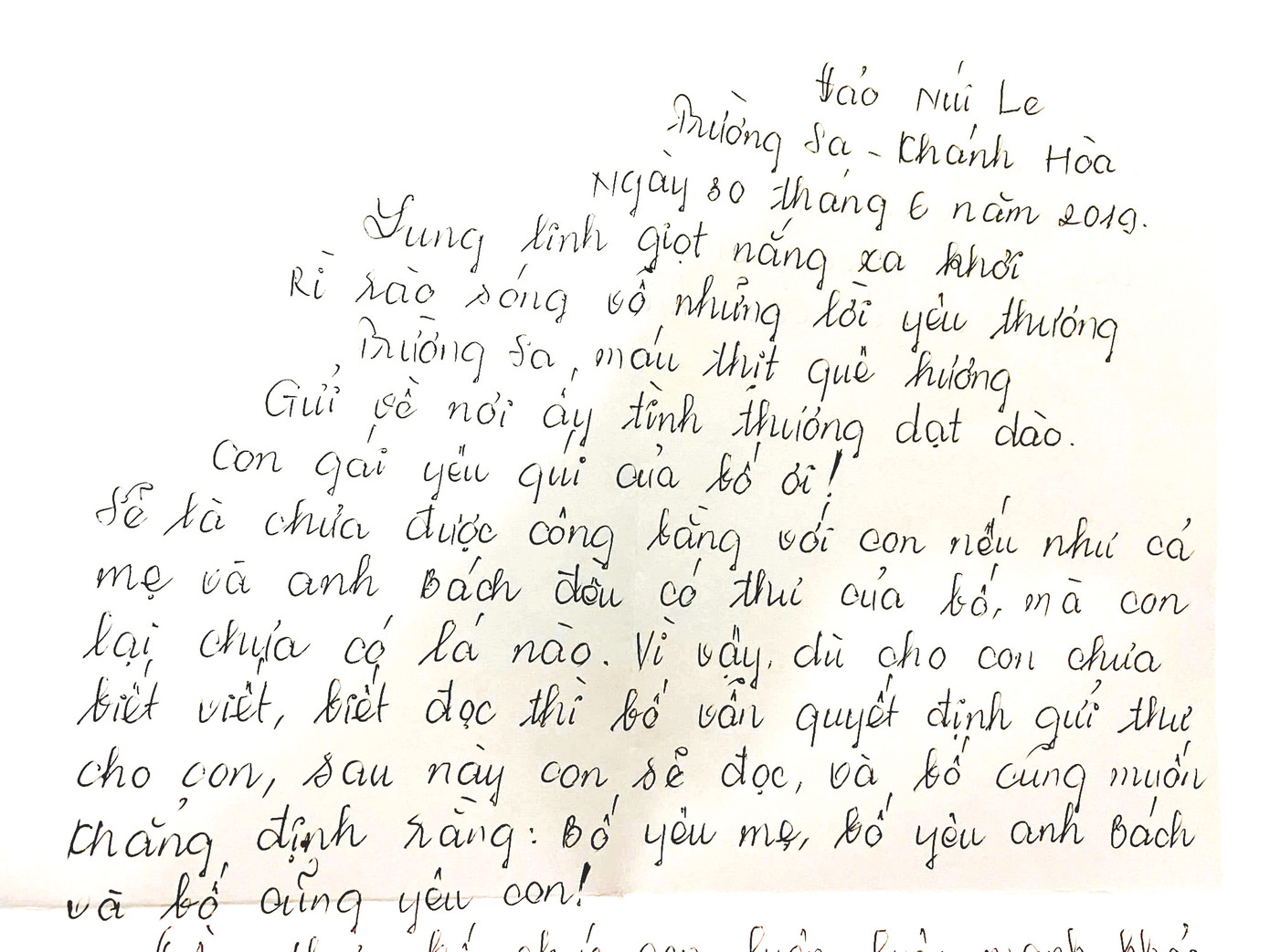 Lung linh giọt nắng xa khơi/ Rì rào sóng vỗ những lời yêu thương/ Trường Sa, máu thịt quê hương/ Gửi về nơi ấy tình thương dạt dào… (Đảo Núi Le, Trường Sa, Khánh Hoà - 30/6/2019). Đó là những câu thơ chan chứa tình yêu của Thiếu tá Doanh trong lá thư tay gửi về cho vợ. Đó cũng là sự động viên tinh thần to lớn với chị Hương trong những thời điểm chồng vắng nhà, một đôi vai gánh hai trách nhiệm làm vợ, làm trụ cột gia đình.