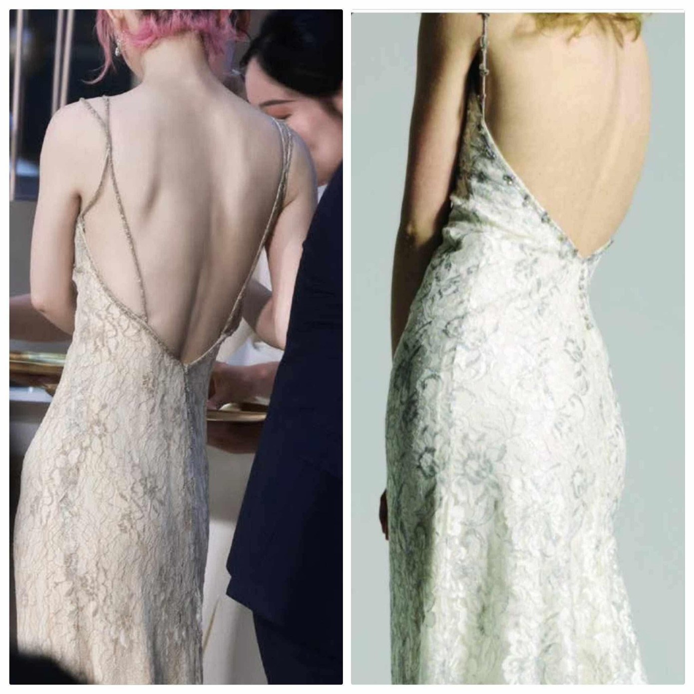 Tuy nhiên, netizen khi so sánh váy mà Triệu Lệ Dĩnh mặc với thiết kế của Collette Dinnigan thì phát hiện nhiều điểm khác nhau. Như trang phục của Triệu Lệ Dĩnh có hai dây mỗi bên vai còn bản gốc chỉ có một, chất liệu ren và họa tiết cũng có khác biệt.
