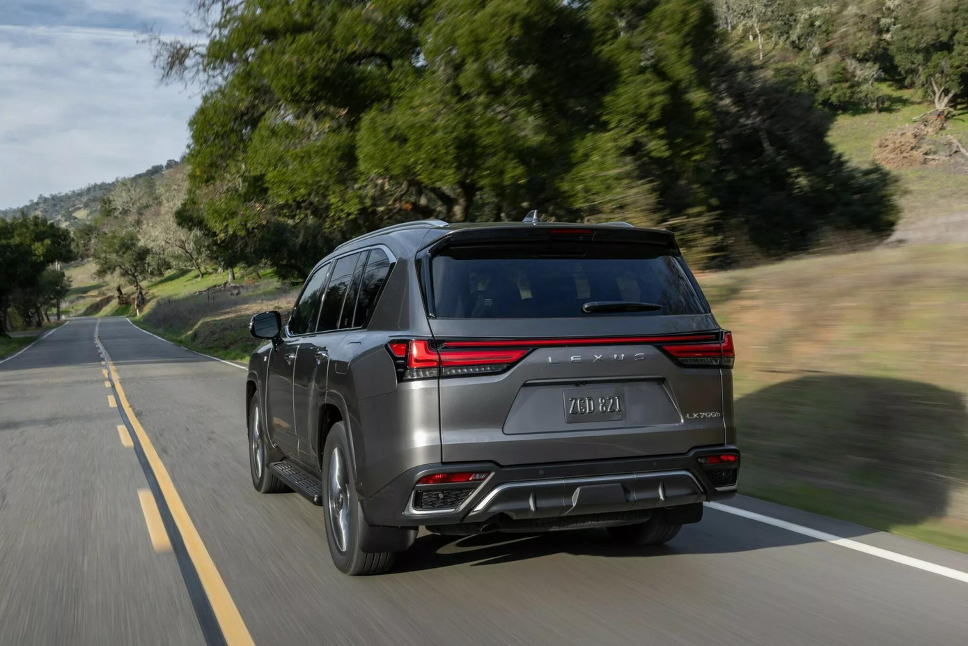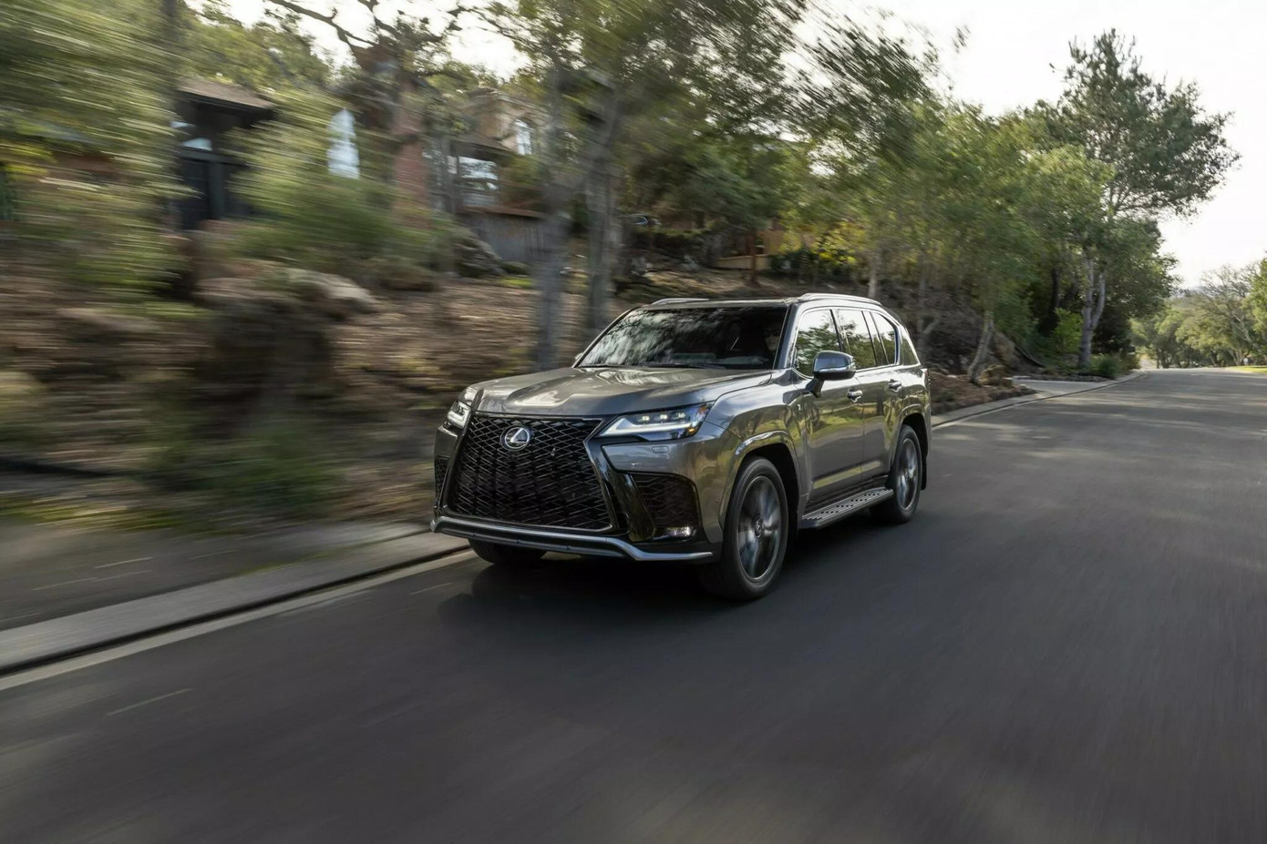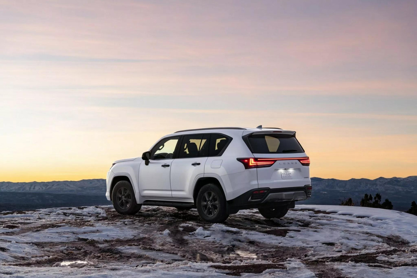 Ngoại thất của phiên bản Lexus LX700h cũng khác biệt hơn với tấm chắn gầm phía trước, lưới tản nhiệt màu xám mờ, tay nắm cửa đen, thanh ray trên nóc màu xám đậm, viền chrome tối màu và ốp vòm bánh xe đen.