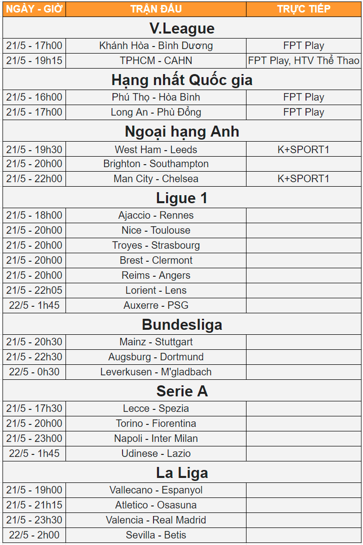 Lịch thi đấu và trực tiếp bóng đá ngày 21/5