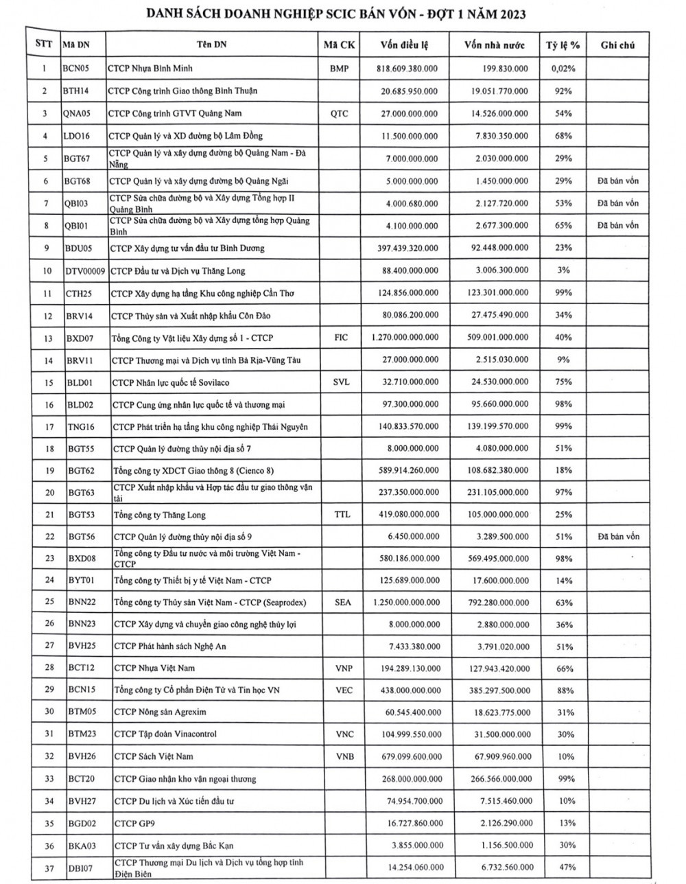 | Danh sách thoái vốn của SCIC đợt 1/2023. |